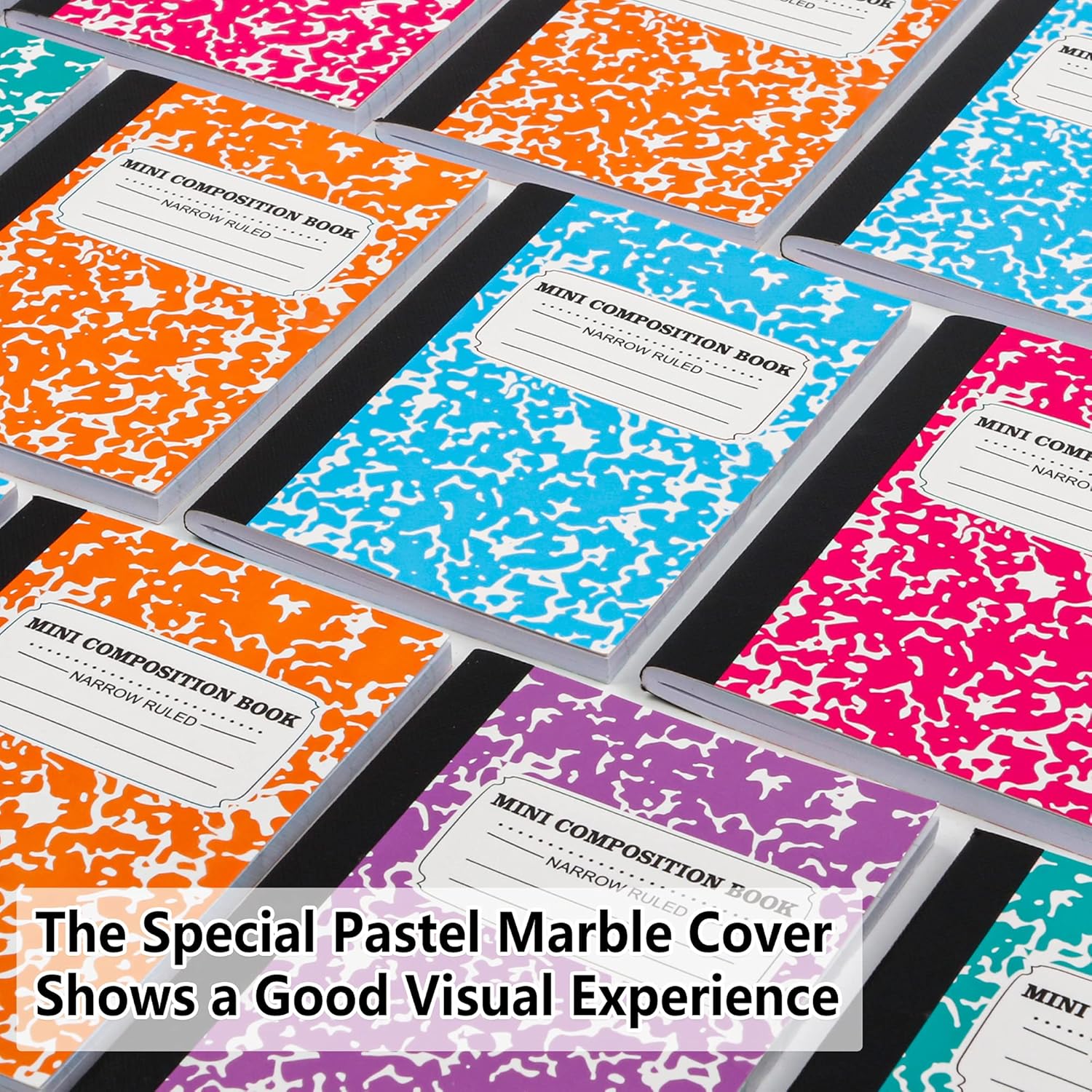 - Feela Mini Composition Notebooks have 5 different pastel bright colors. You can distinguish different subjects or notes with different colors. The special marble pattern on the cover is carefully picked in order to give you a better visual experience.