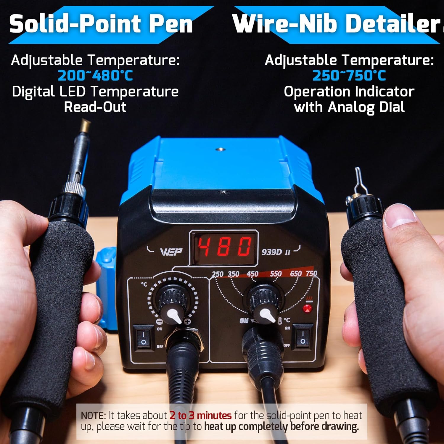 - This woodburner has two detachable wood burning pens that are different from each other, and can be turned ON at the same time. The solid-point pyrography pen is great for heat-transfer, shading, outlining and more. The solid-point pen comes with an adjustable temperature from 200°C ~480°C, and the temperature setting is shown on the station’s digital display. NOTE: It takes about 2 to 3 minutes for the solid - point pen to heat up and 1 to 2 minutes for the wire - nib pen, please wait for the tip to heat up completely before drawing. You can learn more about pyrography in the WEP'S GUIDE TO PYROGRAPHY section of our brand store.