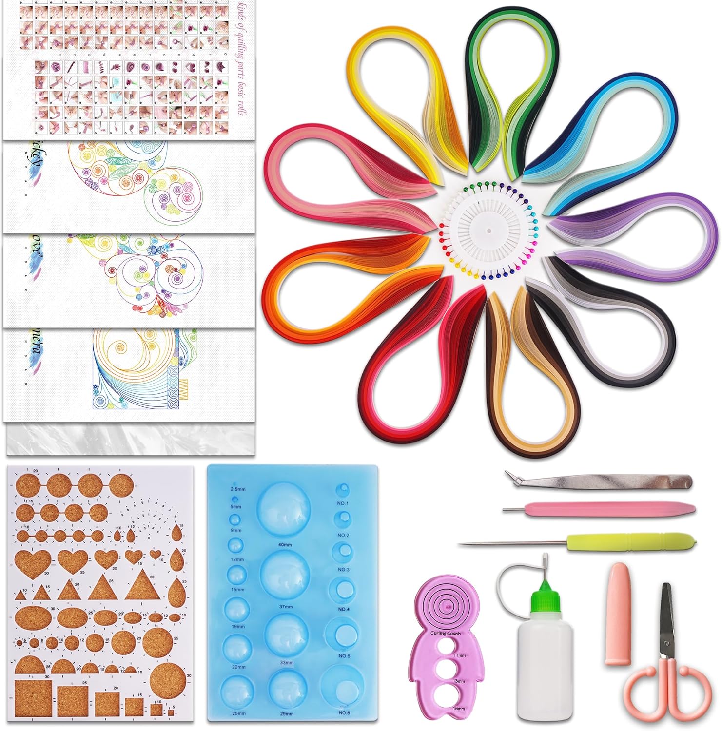 - π[Multi Quilling Tools and Supplies]-Paper quilling sets are equipped with 900 x Paper Quilling Strips, 1 x Quilling Board, 1x Scissors, 1x Bump Style Mold, 40 Pieces Pearl Pins, 1 x Paper Quilling Pen, 1 x Awls, 1 x Curling Coach, 1 x Glue Bottle (no glue), 1 x Tweezers, 1 X Instruction Manual, 3 x Quilling Unique Patterns, 1 x PVC Board