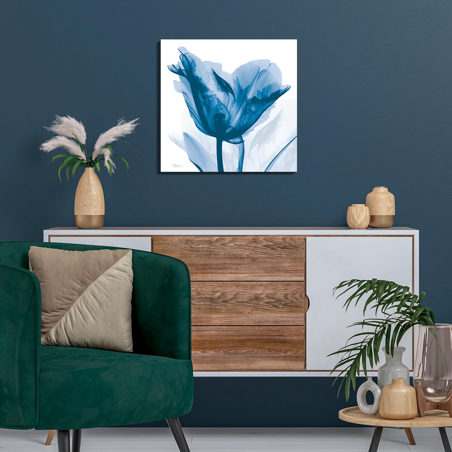- FLOWER, TULIPS FRAMELESS TEMPERED GLASS WALL ART - In collaboration with Albert Koetsier, this beautiful piece displays an X-Ray image of a Lusty Blue Tulip. Digital super high resolution printing artwork on ultra white tempered glass.
