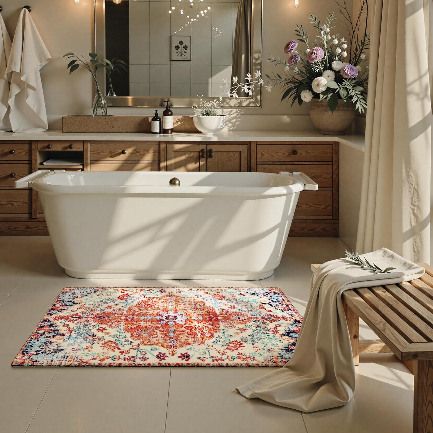 - [Exclusive Design Accent Rug] - The suitable way to brings a refreshing boost of color to your home, this bohemian bedside runner rug is a must-have for your home. It features a cream, orange, and navy blue design patterns with purposeful distressing to add vintage appeal to your space.