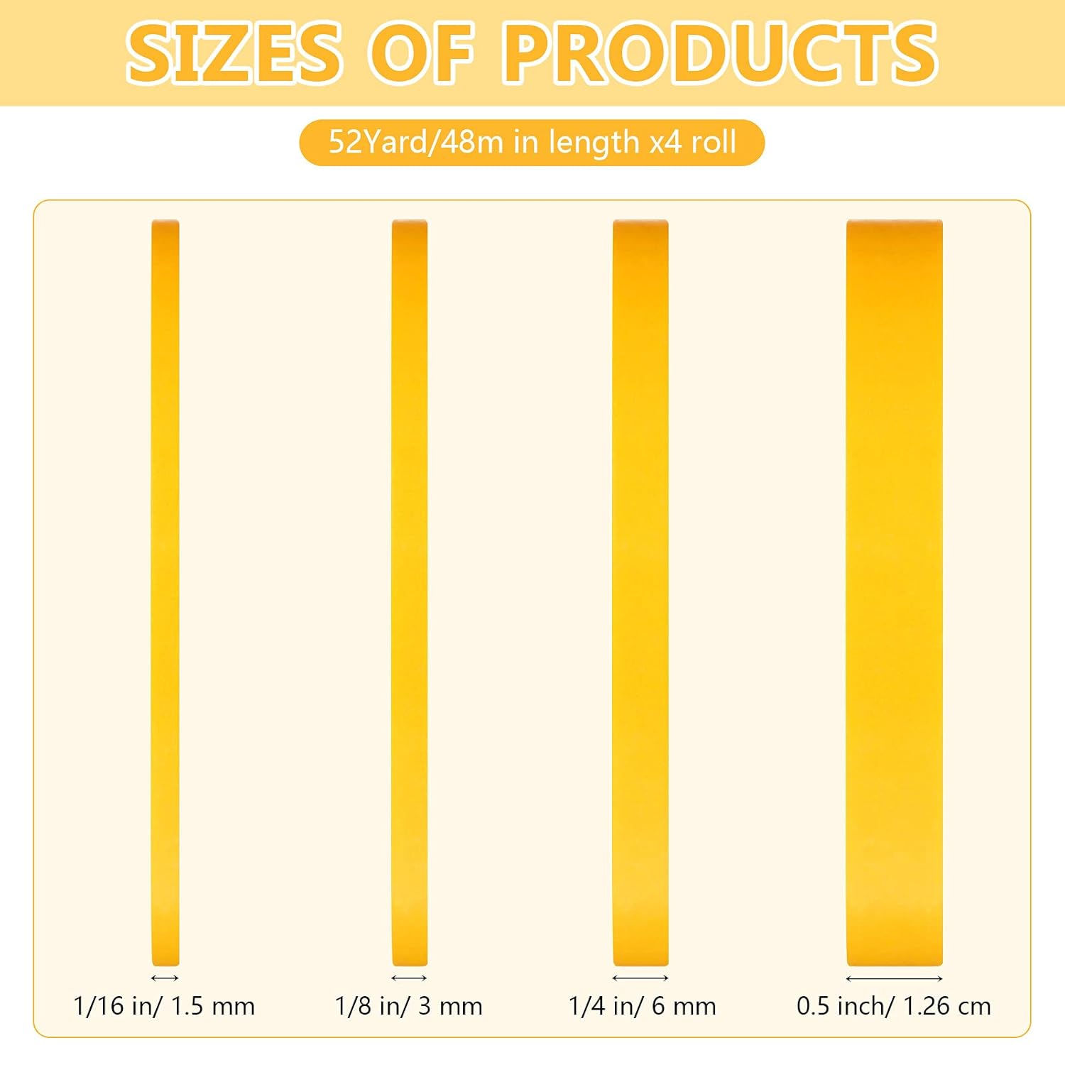 - You will get: there are 4 rolls of masking tapes with different widths, which are 1/16 in/ 1.5 mm, 1/8 in/ 3 mm, 1/4 in/ 6 mm and 1.26 cm/ 0.5 inch; Each masking tape length is 52 yards/ 48 m; Different widths can meet your various needs, and adequate length gives you a longer time service; These masking tapes will let you post the shape, length and width you want at will