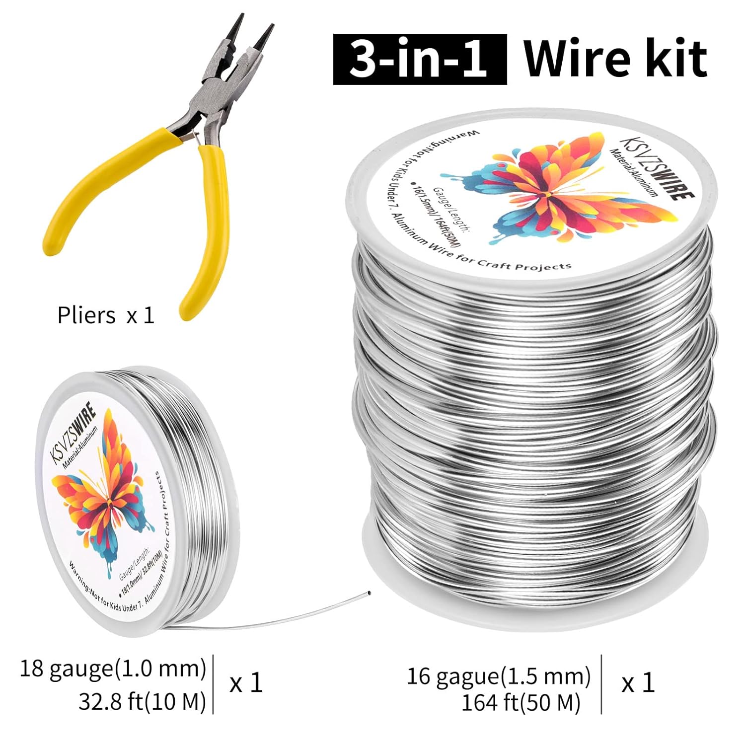 16 Gauge(1.5mm) Aluminum Wire 164 Feet(50M) KSVZS Bendable Metal Wire for Crafts, Sculpting, Armature, Jewelry Making【3-in-1】+18Gauge(1.0mm) 32.8Ft(10M)+1 Pliers(Silver)…