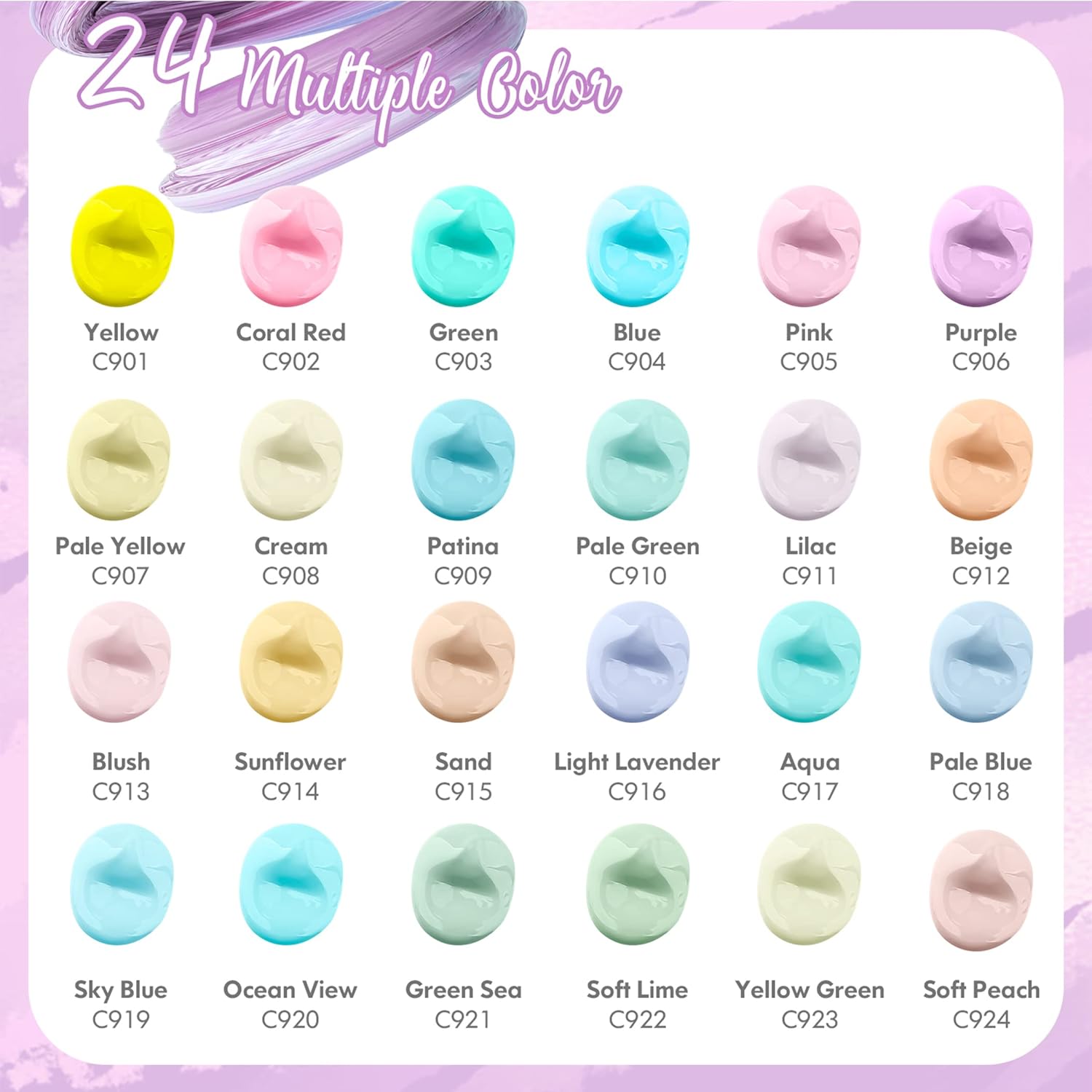 - This art acrylic painting kit comes with 24-pack, 2 oz / 59ml bottles in the pastel colors: Yellow, Coral Red, Green, Blue, Pink, Purple, Pale Yellow, Cream, Patina, Pale Green, Lilac, Beige, Blush, Sunflower, Sand, Light Lavender, Aqua, Pale Blue, Sky Blue, Ocean View, Green Sea, Soft Lime, Yellow Green, Soft Peach.