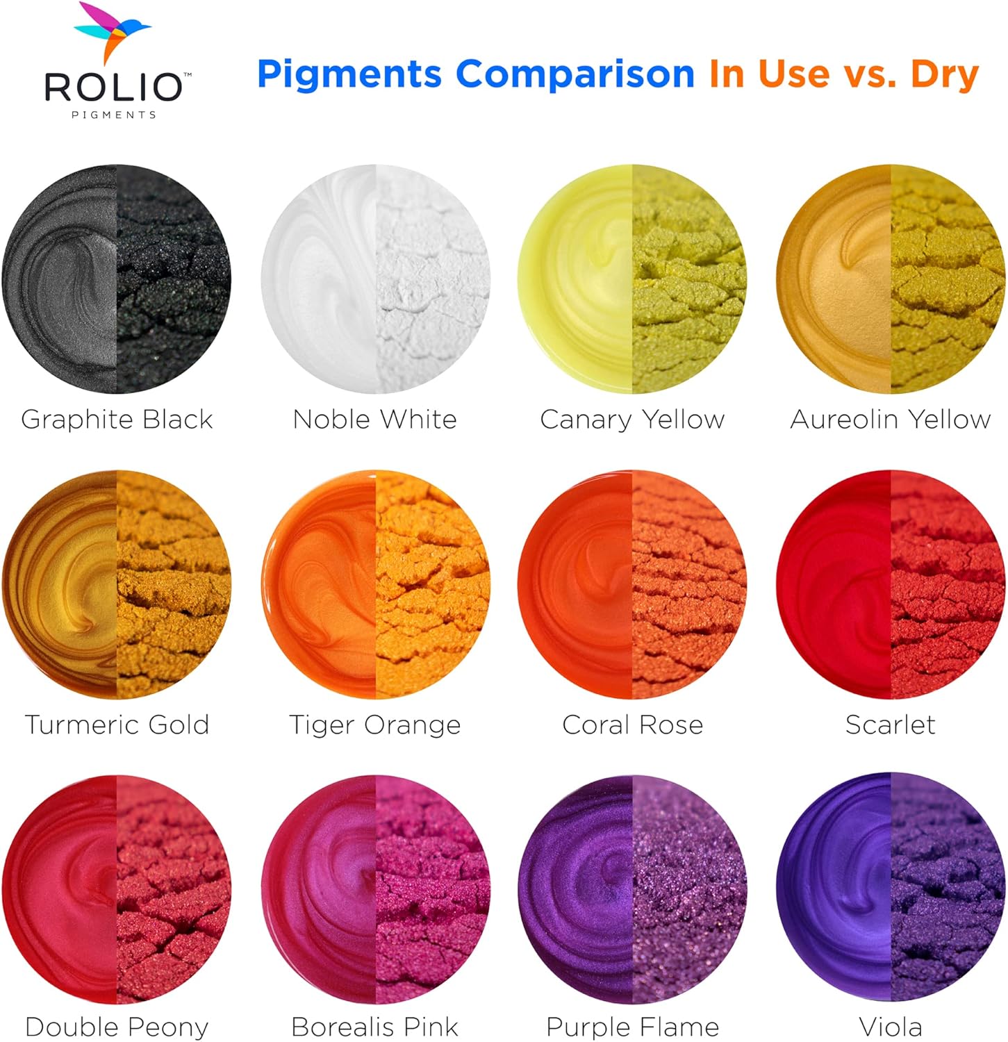 - FINE PIGMENTS - Rolio’s fine pigments are formulated to be safe and easy to use for any project. With 12 high intensity colors you can mix to create any color you can imagine! Comes with: Graphite Black, Noble White, Egyptian Green, Celeste Blue, Persian Green, Olive Gold, Canary Yellow, Aureolin Yellow, Turmeric Gold, Tiger Orange, Coral Rose, Scarlet - Rolio