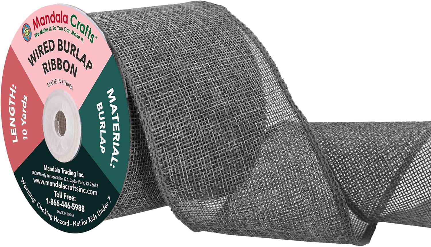 Mandala Crafts Gray Burlap Wired Ribbon 3 Inches Wide Jute Ribbons for Crafts - 10 Yds Roll Rustic Burlap Wrap Trim Ribbons for Wreaths Bows Party Decoration
