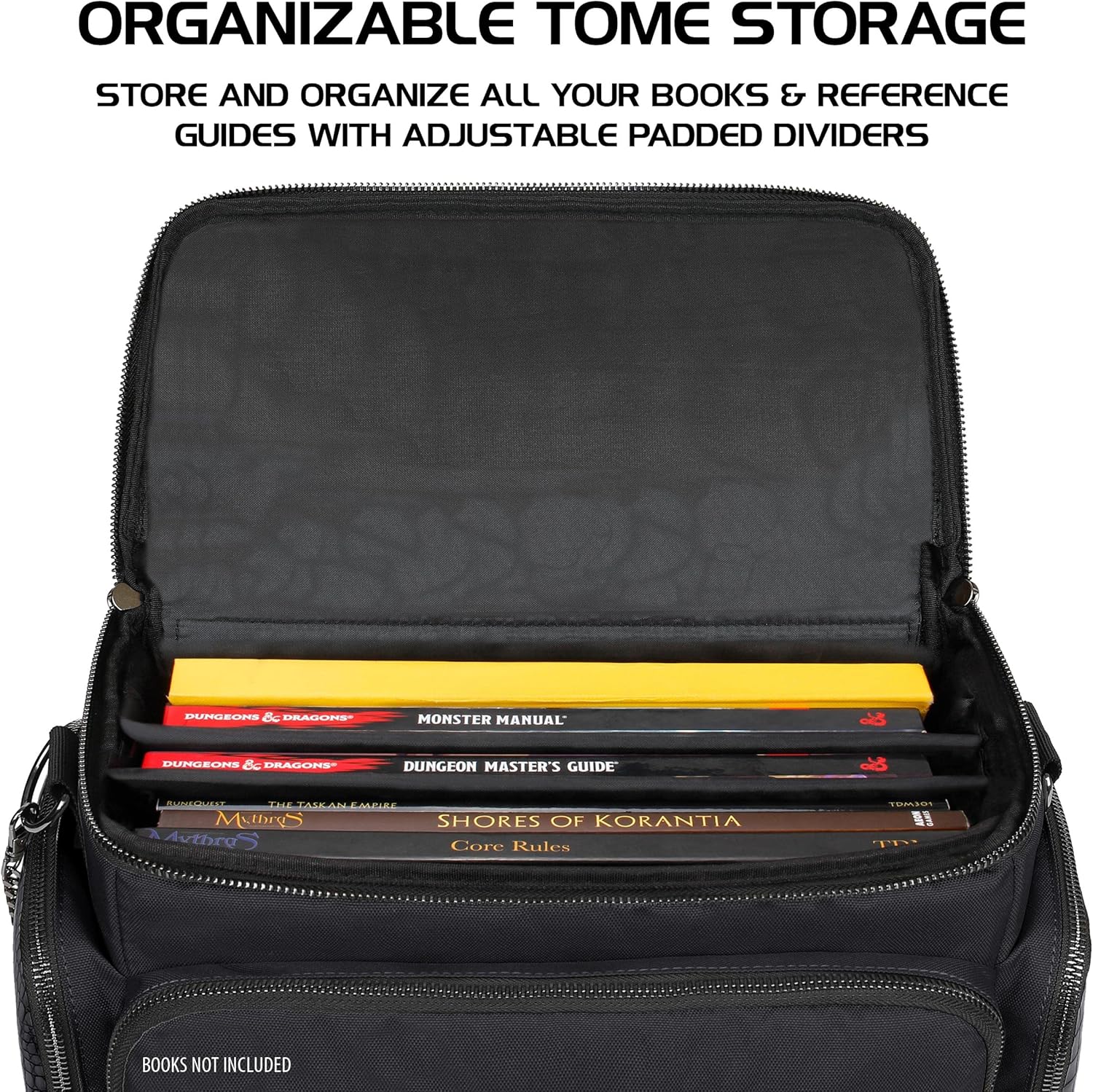- RPG BAG FOR YOUR PERSONAL ARCANE LIBRARY: Store 4-8 books, sheets, and reference material for your next session in the spacious main compartment complete with a padded divider for custom organization