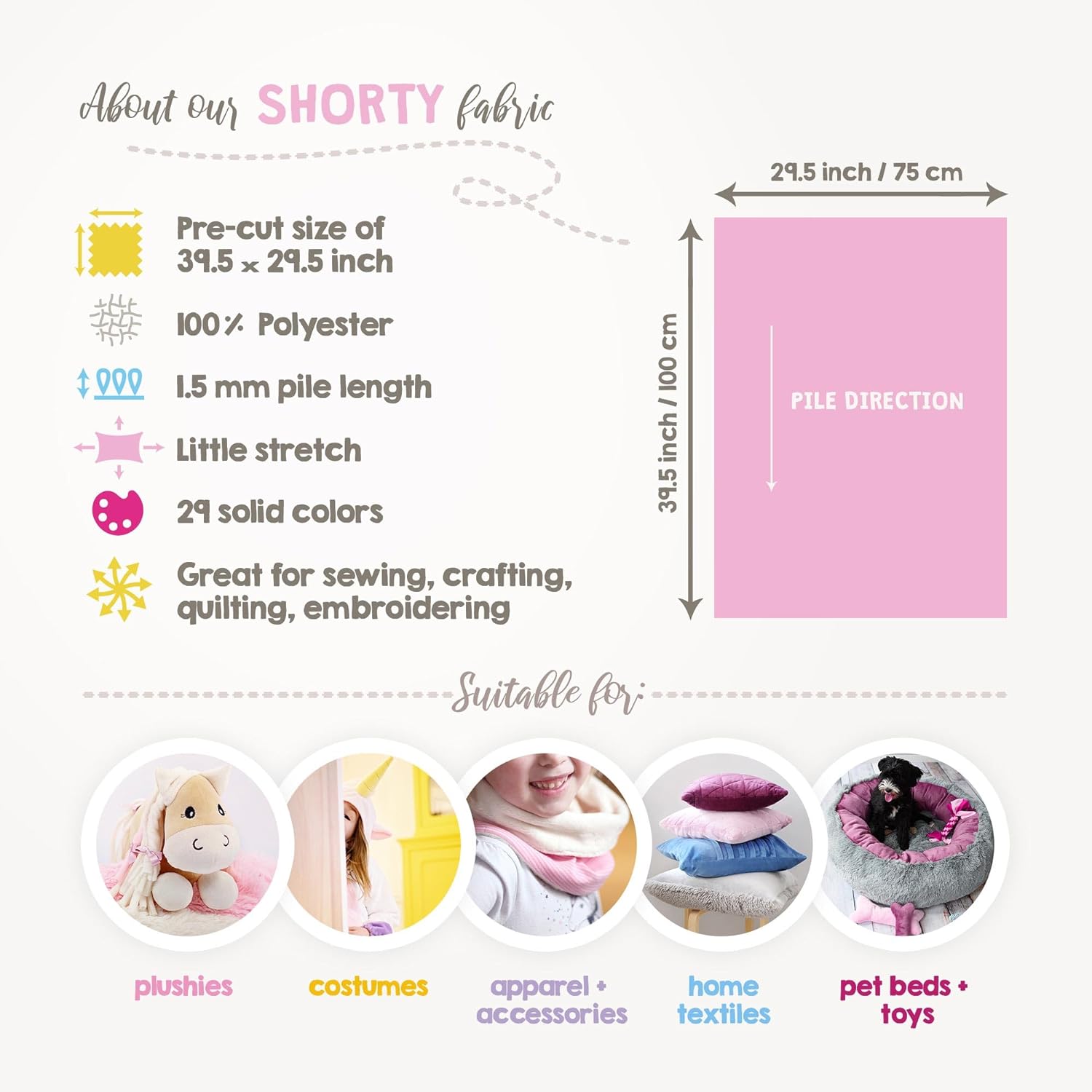 - High-quality plush material: Pre-cut, slightly stretchy minky fabric made from 100% polyester microfiber with a size of 39.5x29.5 inch (100Γ75 cm). Our fuzzy, durable & easy-to-sew plush fabric retains its comfort, softness and vibrant color even after multiple washes, ensuring long-lasting quality.