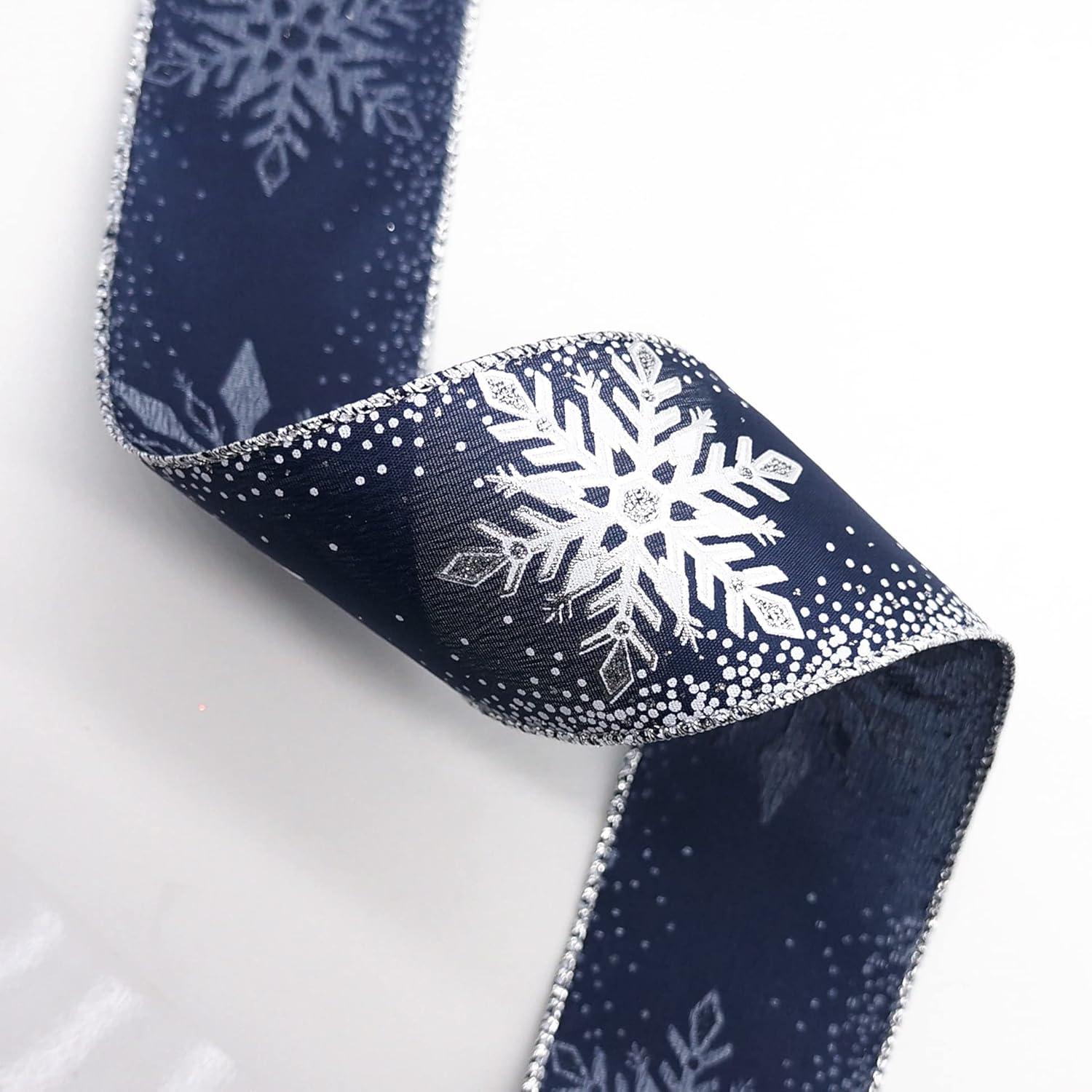 - EASY TO USE - The 10-yard long navy satin with silver snowflake wird ribbon 2.5" is enough for all the decorating and accenting your DIY Crafts. The navy satin with silver snowflake wird ribbon 2.5" is easy to use and wonโt tangle. It can be tied or glued on gift packages and DIY craft projects such as car and chair bow, wreath, flower bouquet.