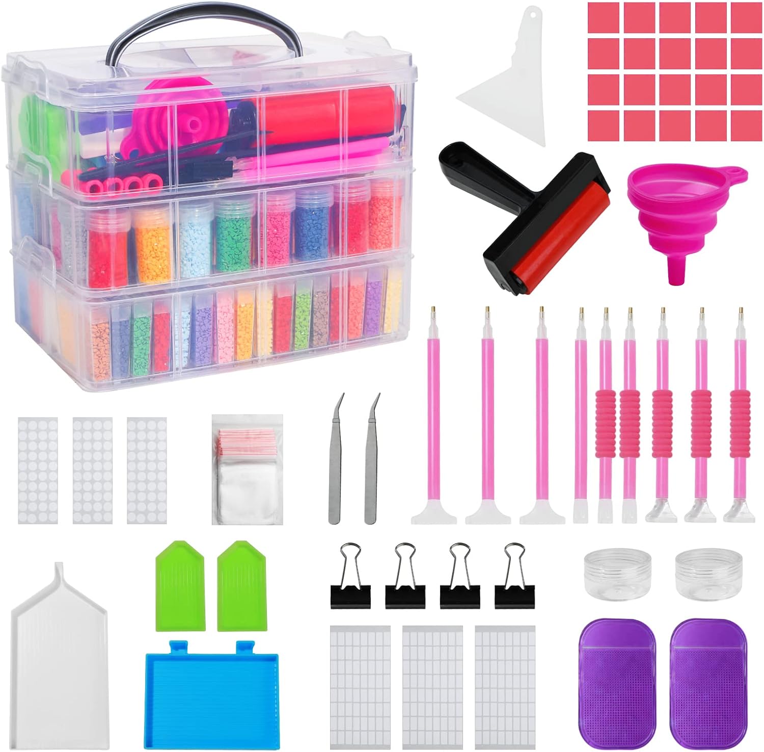 Douorgan 3-Tier Diamond Painting Storage Containers Diamonds Organizers and Storage Stackable Diamond Painting Tools Box Portable Diamond Beads Storage Box, 80+40 Slots with Tool Set
