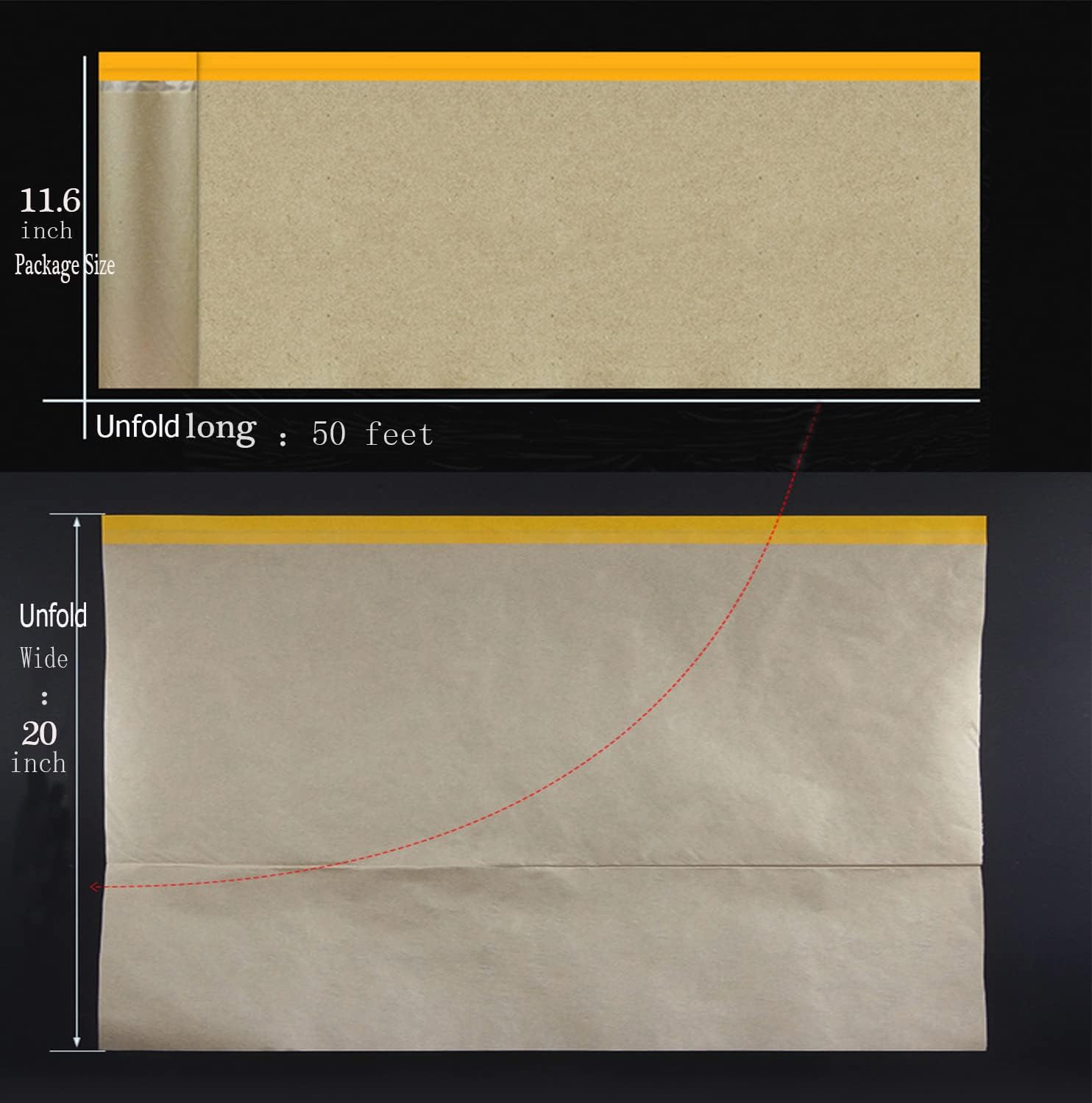 - 【Easy to Use】 Our paint masking paper is super easy to apply, masking paper roll design, the roll is packaged with the paper folded in half(Each roll is 20 inches wide and 50 feet long).You just need to unroll the paper roll and stick the sticky side firmly on right position,then cut it with scissors or tear it by hand, the painters paper roll will cover the protected object evenly.