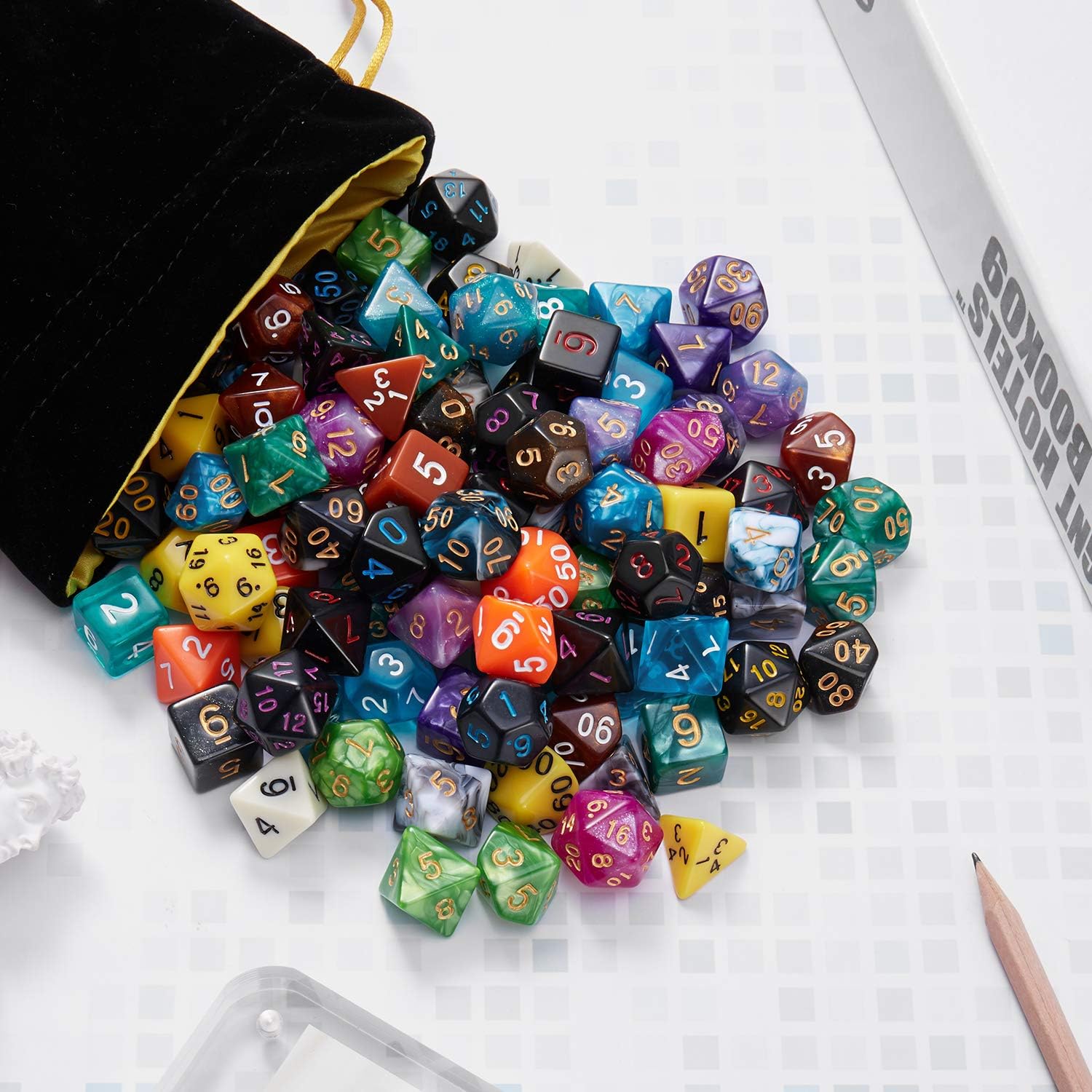 - DnD Dice Set: 20 sets of polyhedral dice, contains 5 sets of two-color dice. A total of 140 pieces .with a big Drawstring Bag.