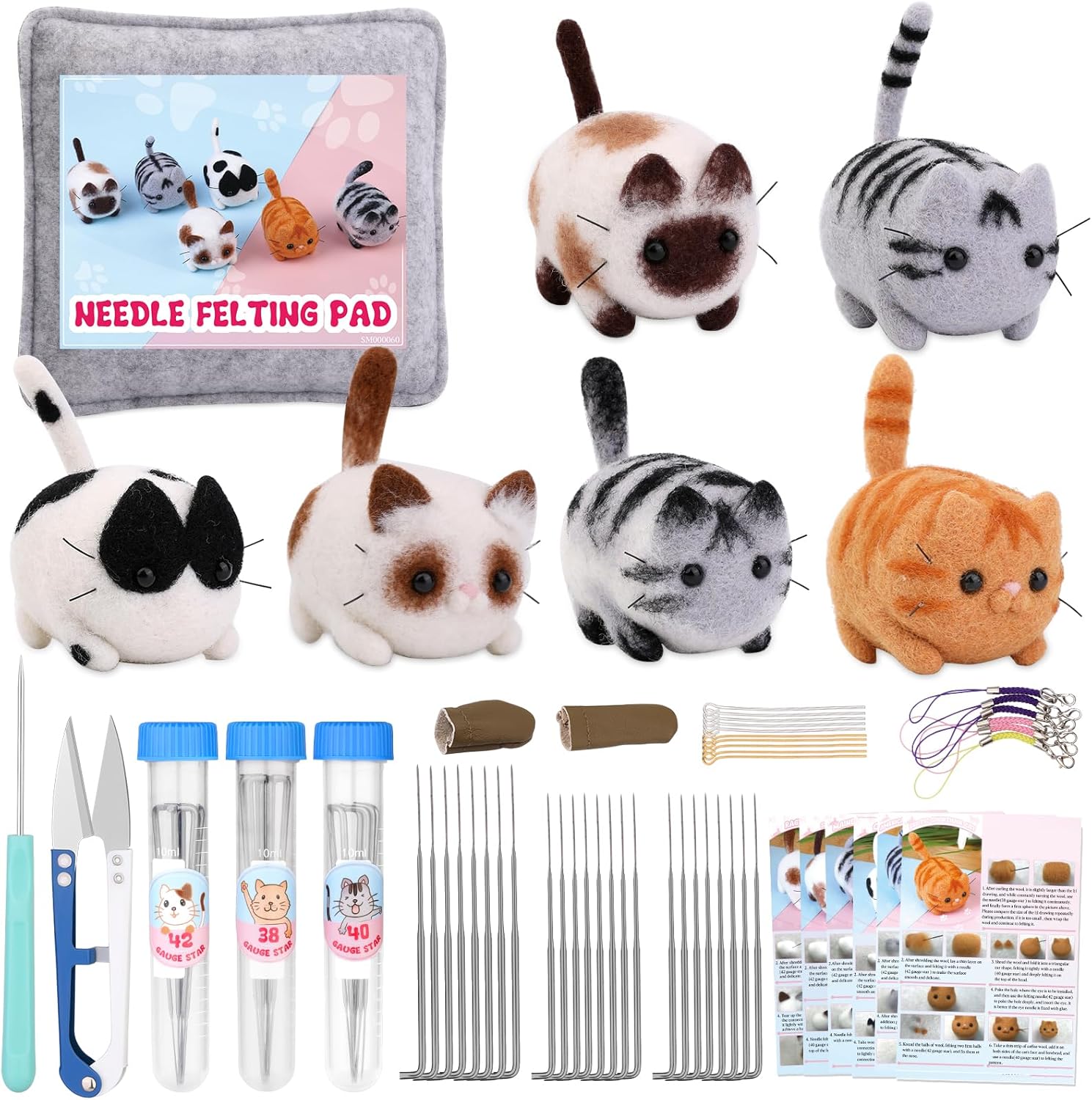 - Complete Needle Felting Kit: The needle felting kit includes tools required for wool felt; 6 x cat series felting wool; 1 x needle felting pad; 24 x felting needles(38 gauge x 8, 40 gauge x 8, 42 gauge x 8);1 x awl;1 x yarn scissors; 6 x keychain,;10 x 9-shape needles(random color); 1 x storage box; 2 x finger cots(random color); 6 x instruction manual;you can easily complete making these needle felting dolls