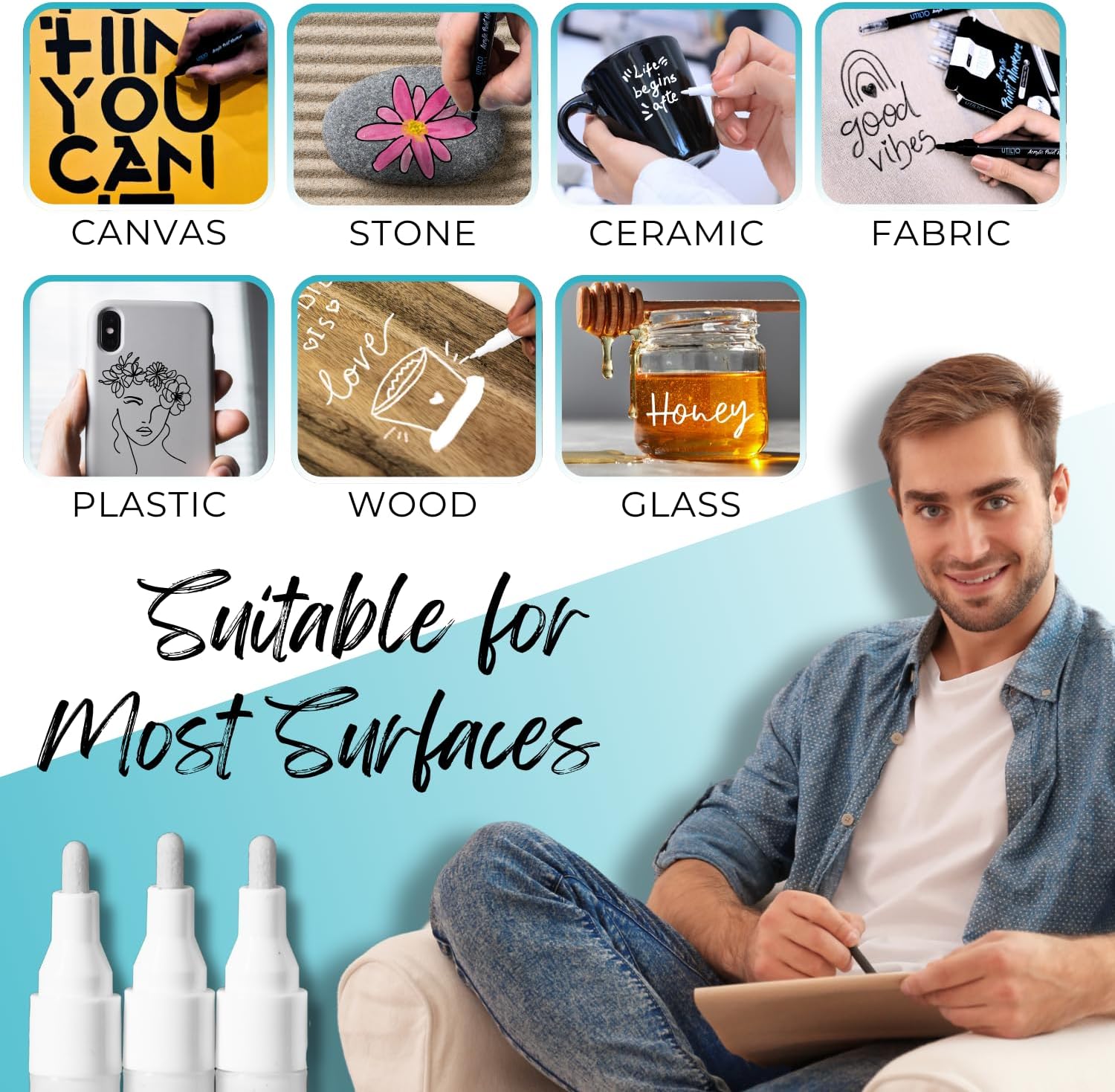 - MULTI-SURFACE APPLICATION: These versatile paint pens are suitable for use on a variety of surfaces, including stone, wood, glass, fabric, plastic, ceramic, metal, rubber and more, allowing you to unleash your creativity on any medium.