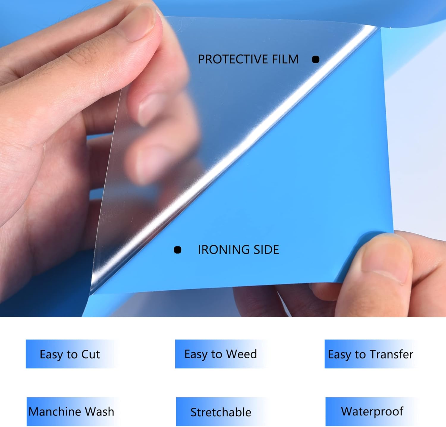 - Glossy heat transfer vinyl HTV: Our Blue htv iron on vinyl is made out of the highest quality polyurethane that is incredibly strong, durable and vibrant fine Using the special technology, the htv is thin and extremely durable and soft. The whole weeding process just like a breeze at the help of sticky back.