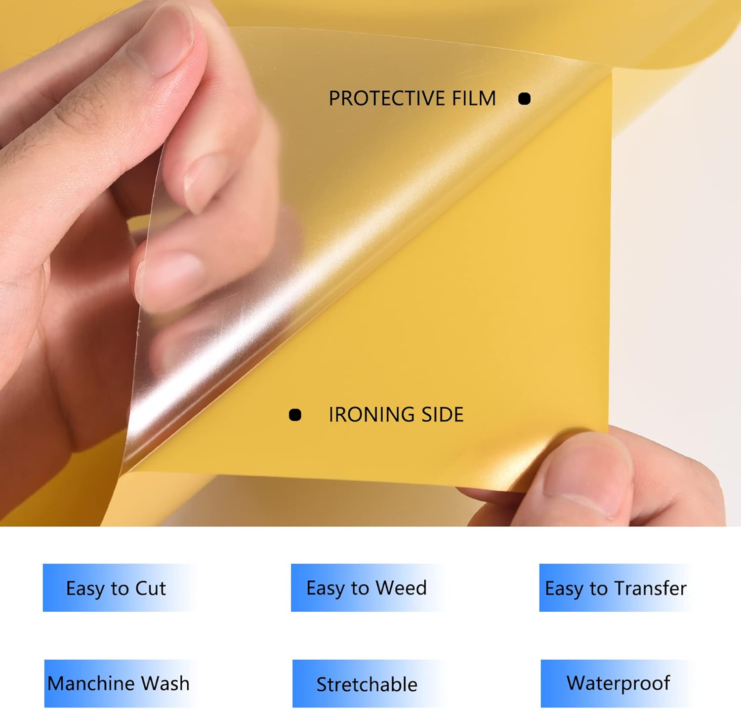 - Glossy heat transfer vinyl HTV: Our Golden htv iron on vinyl is made out of the highest quality polyurethane that is incredibly strong, durable and vibrant fine Using the special technology, the htv is thin and extremely durable and soft. The whole weeding process just like a breeze at the help of sticky back.