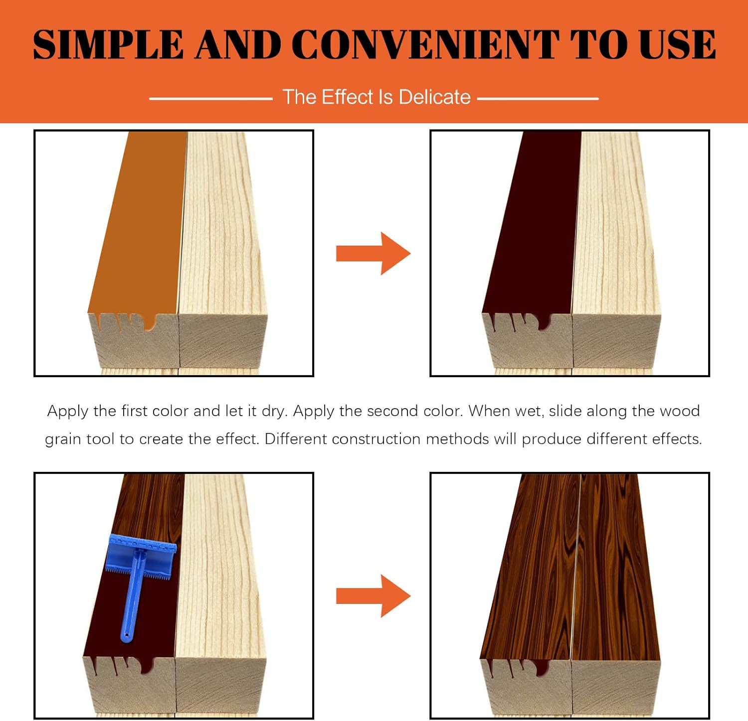 - π―[Easy to Use] You just need to paint the first color and let it dry. And then paint the second color. When the wall is still wet, slide along the wood grain tool to create the wood effect. Besides, our wood grain tools are easily washed with soap and water. You don't need to worry about the paint from last time will affect the next-time use.