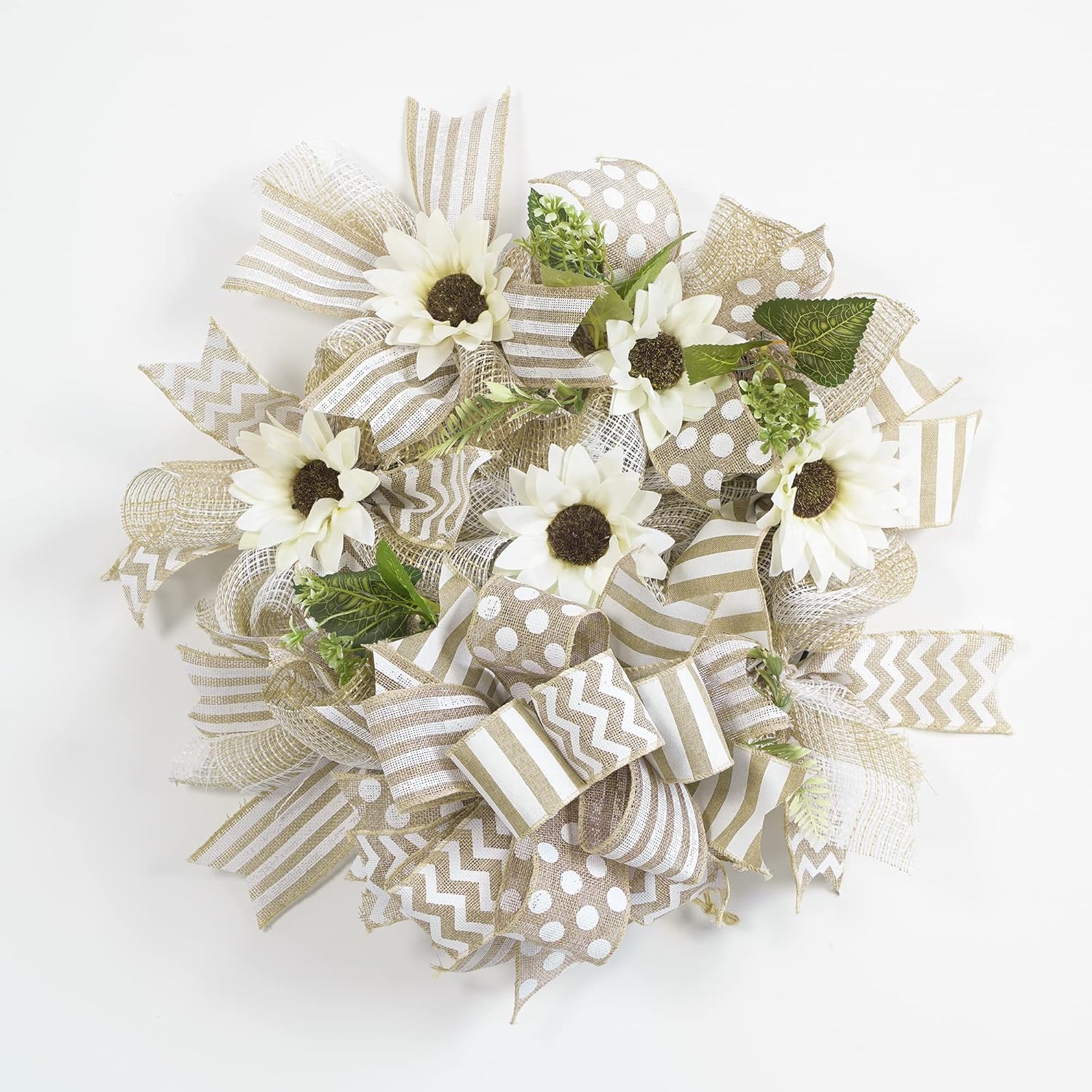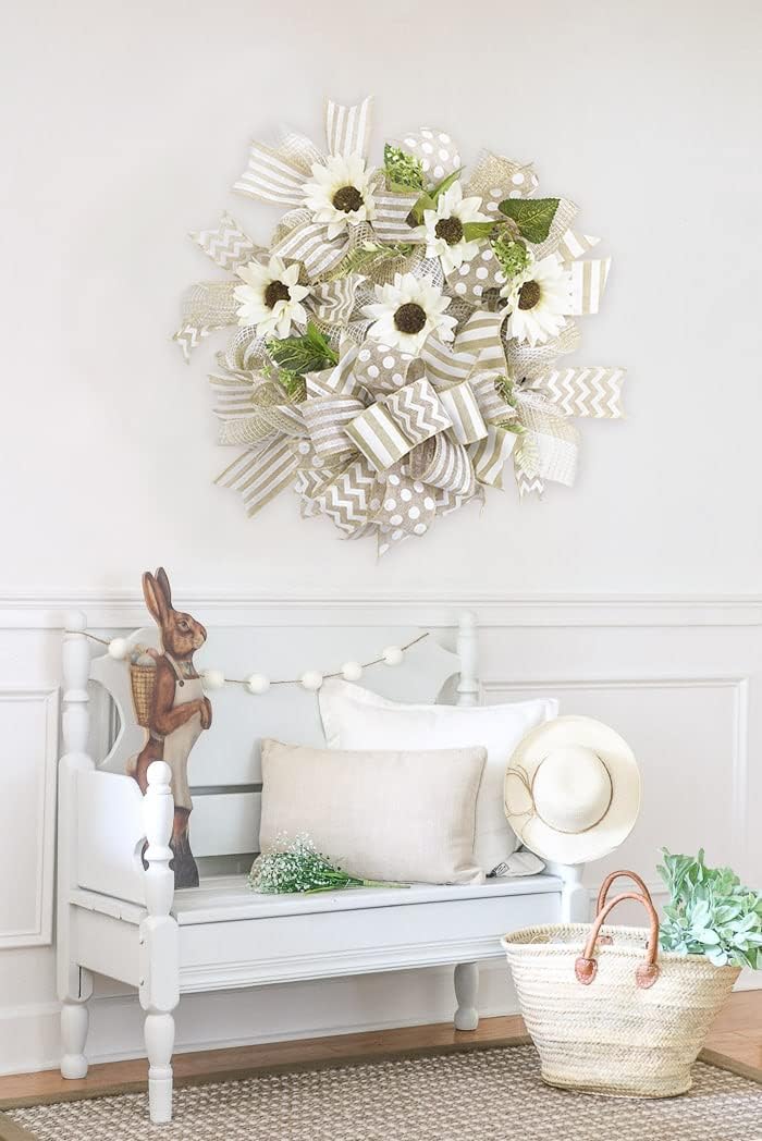- Burlap ribbon with white wide stripe wired ribbon for wreaths or bows 2.5" x 10 yards by the roll. The ribbon has an tan threaded wired edge. Ribbon is shipped on the spool and would be beautiful for all of your craft needs, great product for wreath makers!