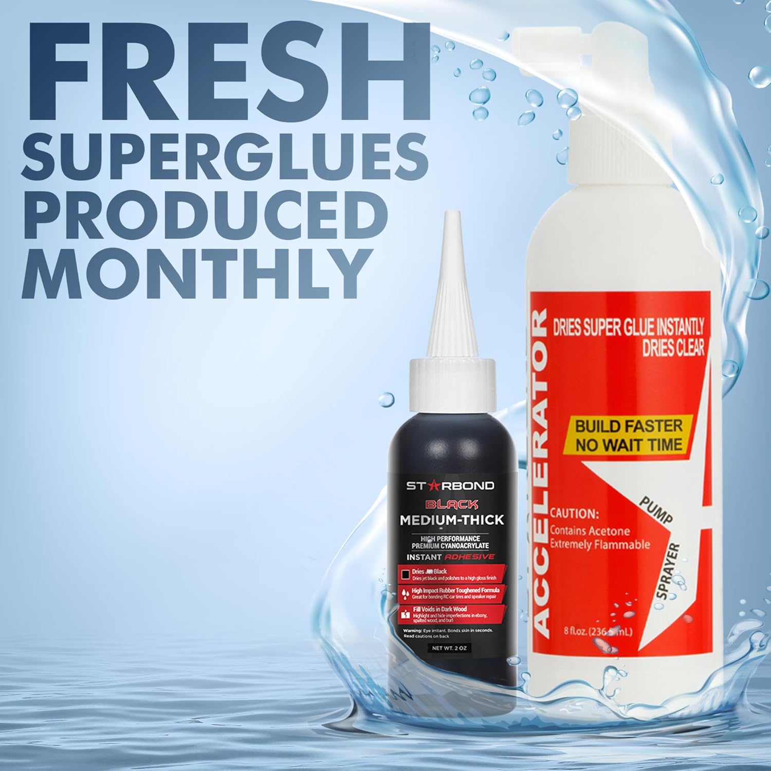 - β PREMIUM CYANOACRYLATE SUPER GLUE - LAB TESTED FOR OPTIMAL PERFORMANCE: High performance industrial grade adhesive. Starbond Black Medium Thick CA and Accelerator is a reliable time efficient system used to fill small wood knots, cracks, voids, and bug holes. Applying the glue in thinner layers around is recommended for larger and deeper voids.