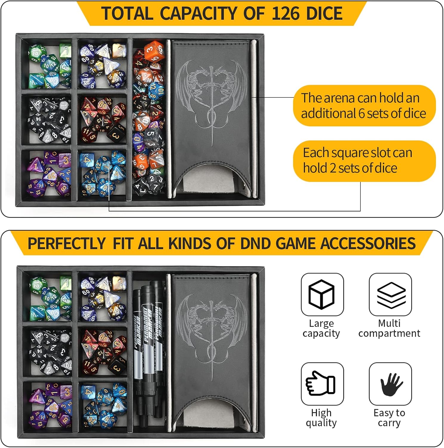 - 【Super Storage Space】- The square slot measures 2" x 2" x 1.5", each slot can hold 2 sets of standard game polyhedral dice or DND miniatures, the rolling area can also hold Erasable marker pens or game dice and other game accessories besides the dice tower