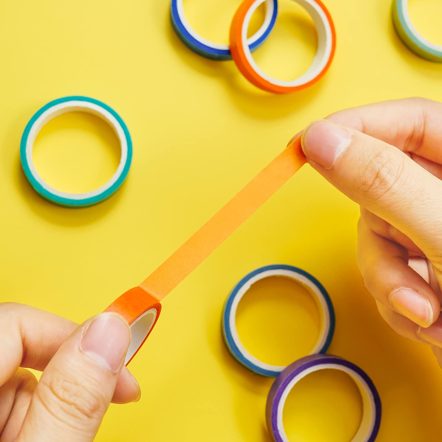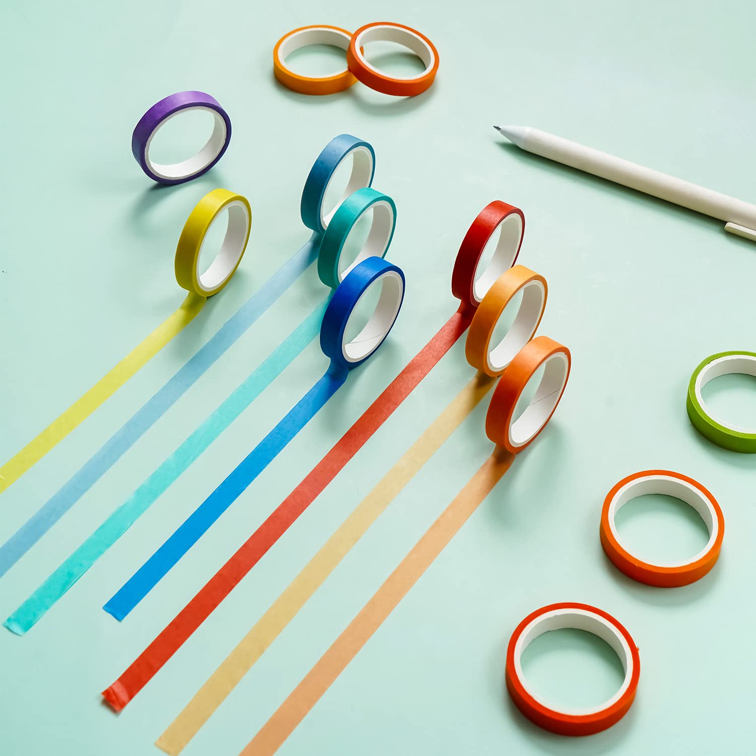 - 🌈Washi tape set: 0.3 inch(8mm) wide x 10 feet(3m) long, 60 colors, this casual washing tape adds color and vitality to the pasted items, making daily life more interesting. 60 rolls includes red, orange, yellow, green, cyan, blue, purple and more rainbow colors.