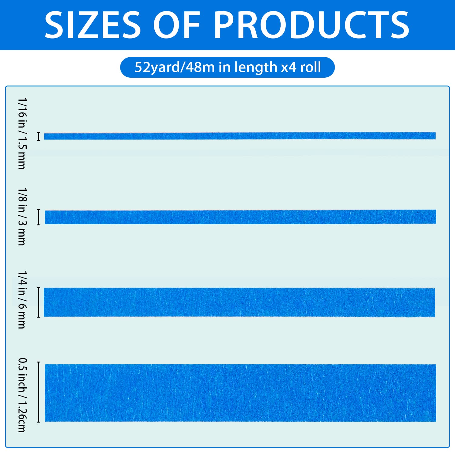 QDiShi 4 Rolls Fine Line Tape(Blue), Fineline Masking Tape in 1/16, 1/8, 1/4 and 1/2 Inch Wide x 52 Yard Long, Automotive Masking Tape for DIY Car Auto Paint Art