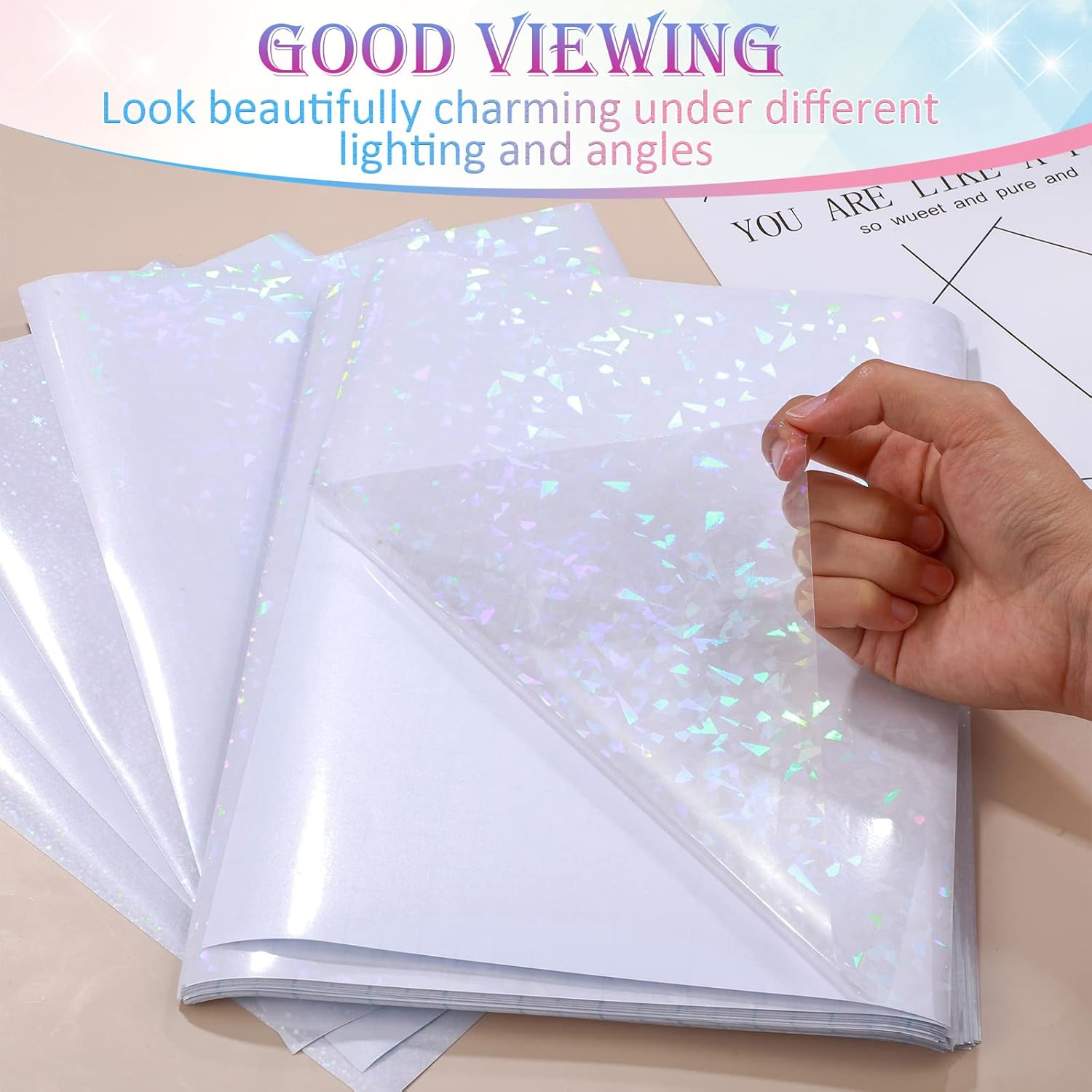 - Broadly Applicable: transparent holographic films are easy to cut and suitable for different DIY projects, such as photo scrapbooks, posters, letters, books, murals, envelopes, gift bag labels, home decor, car stickers, laptop or cell phone stickers, bumper stickers and more, practical and convenient