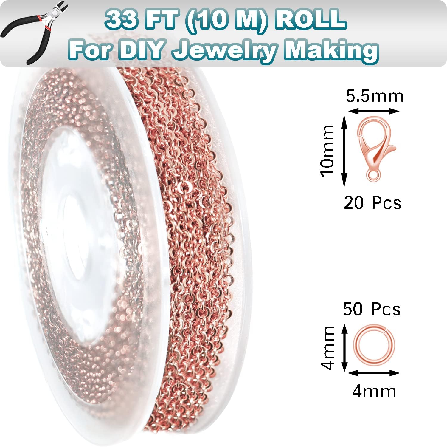 - 33 FEET ROLL SET: 33ft (10m) Rose Gold Jewelry Making Chain Roll - 20 Rose Gold Lobster Clasps - 50 Rose Gold Jump Rings.