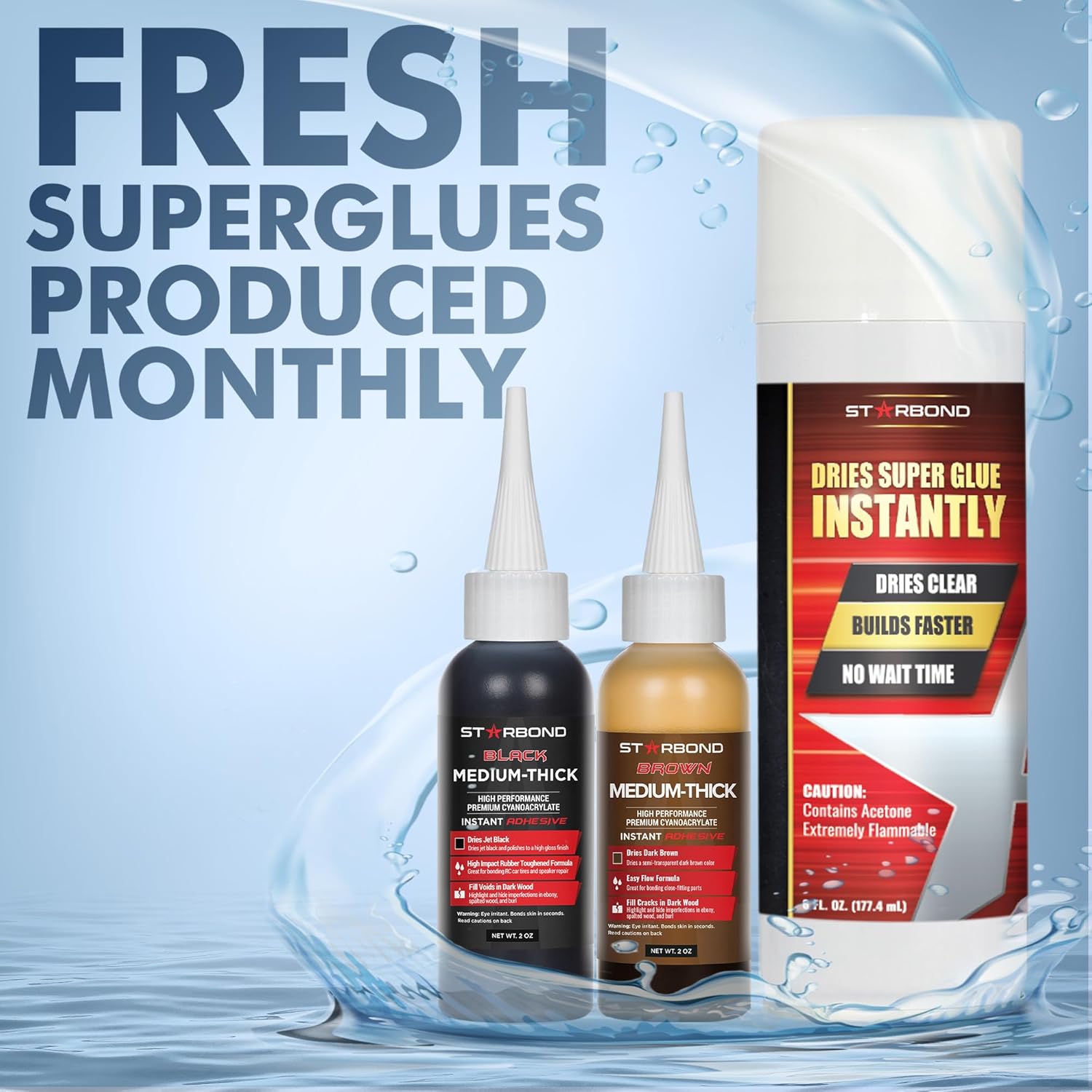 - ✅PREMIUM CYANOACRYLATE SUPER GLUE - LAB TESTED FOR OPTIMAL PERFORMANCE: High-performance industrial-grade adhesive, Black Medium-Thick CA bonds parts with an emphasis on impact and shock absorbance. Brown Medium-Thick CA dries a natural-looking dark coffee brown, similar to Starbond Black CA glues, for knot and void filling.