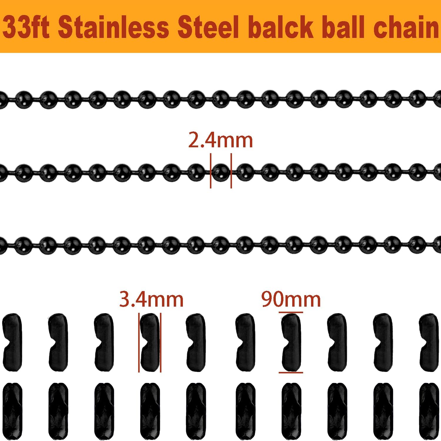 - 33 FEET ROLL SET: 33ft (10m) Black stainless steel ball chain in a spool with 20 pack Black stainless steel ball chain connectors.