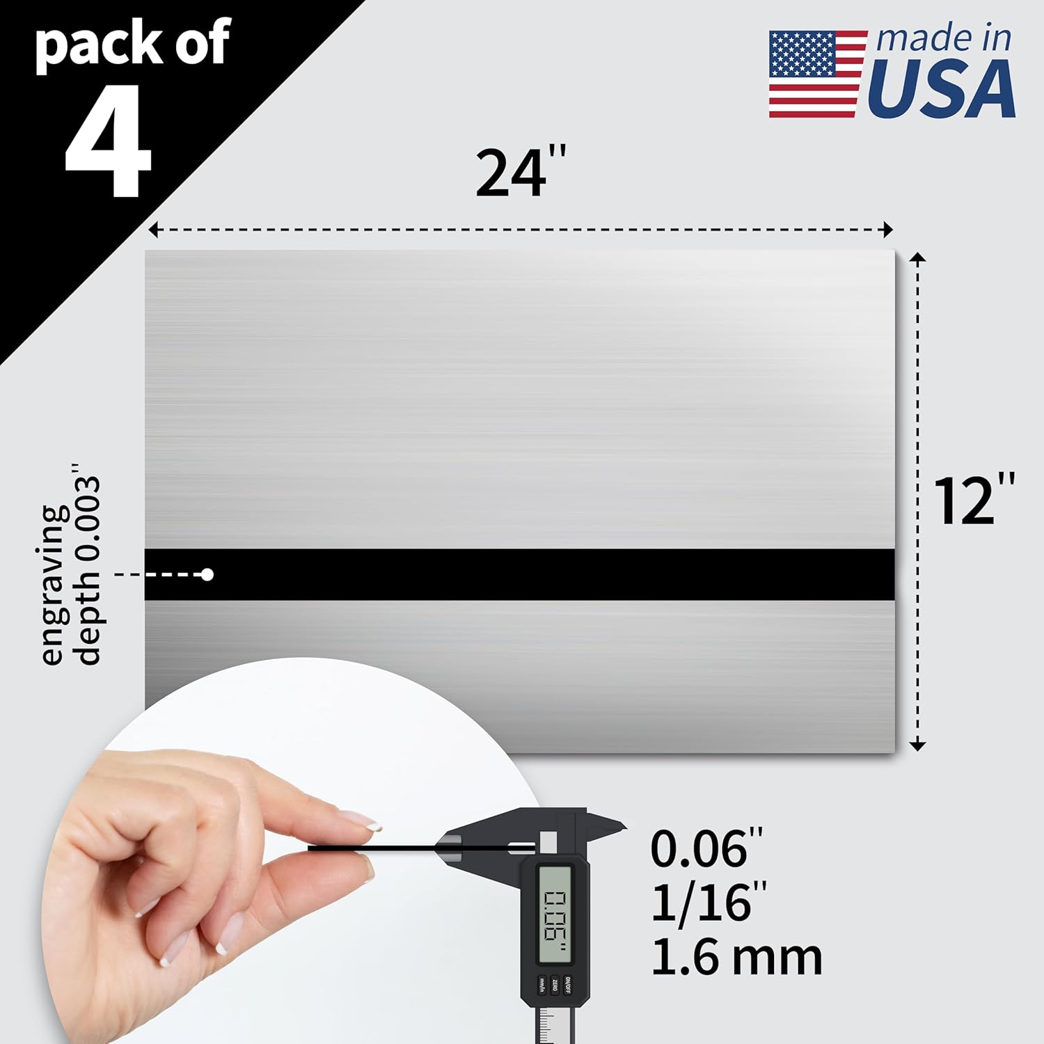 - Technical Data: Size: 12"x24.25" | Thickness: 0.06β (1/16", 1.6 mm) | Engraving depth: 0.003" (0.8 mm) | Top Color: Brushed Silver | Core Color: Black (RAL 7021) | Transmittance: Opaque