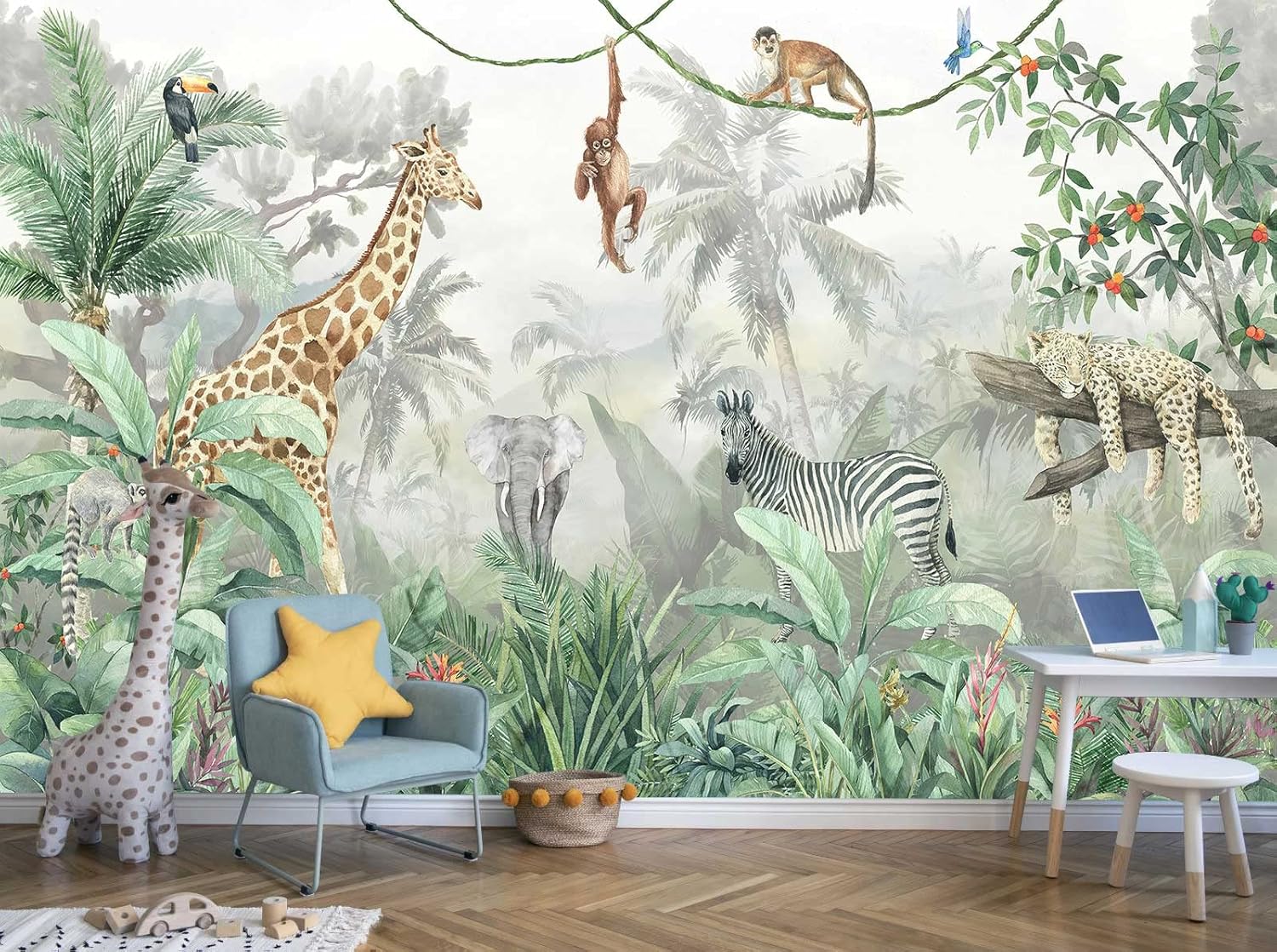 Kids Wallpaper Tropical Leves and Safari Animals Wall Mural for Wall Bedroom Living Room TV Background Sofa Wall(Not Peel and Stick)
