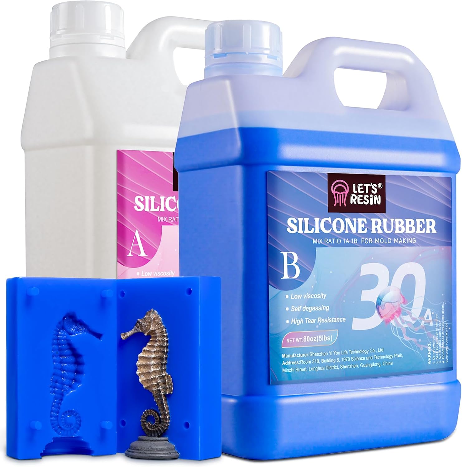 - 【Large Volume 160OZ/10LBS & Extremely Durable】: LETS RESIN silicone mold making kit comes with 2 bottles, each bottle containing 80oz/5lbs of platinum cure silicone, which is a very safe silicone material, non-toxic and odorless; the silicone mold finished with LET'S RESIN 30A silicone rubber has higher tear strength & resistance, not easily break, great silicone rubber mold making for simple one or two-part block molds