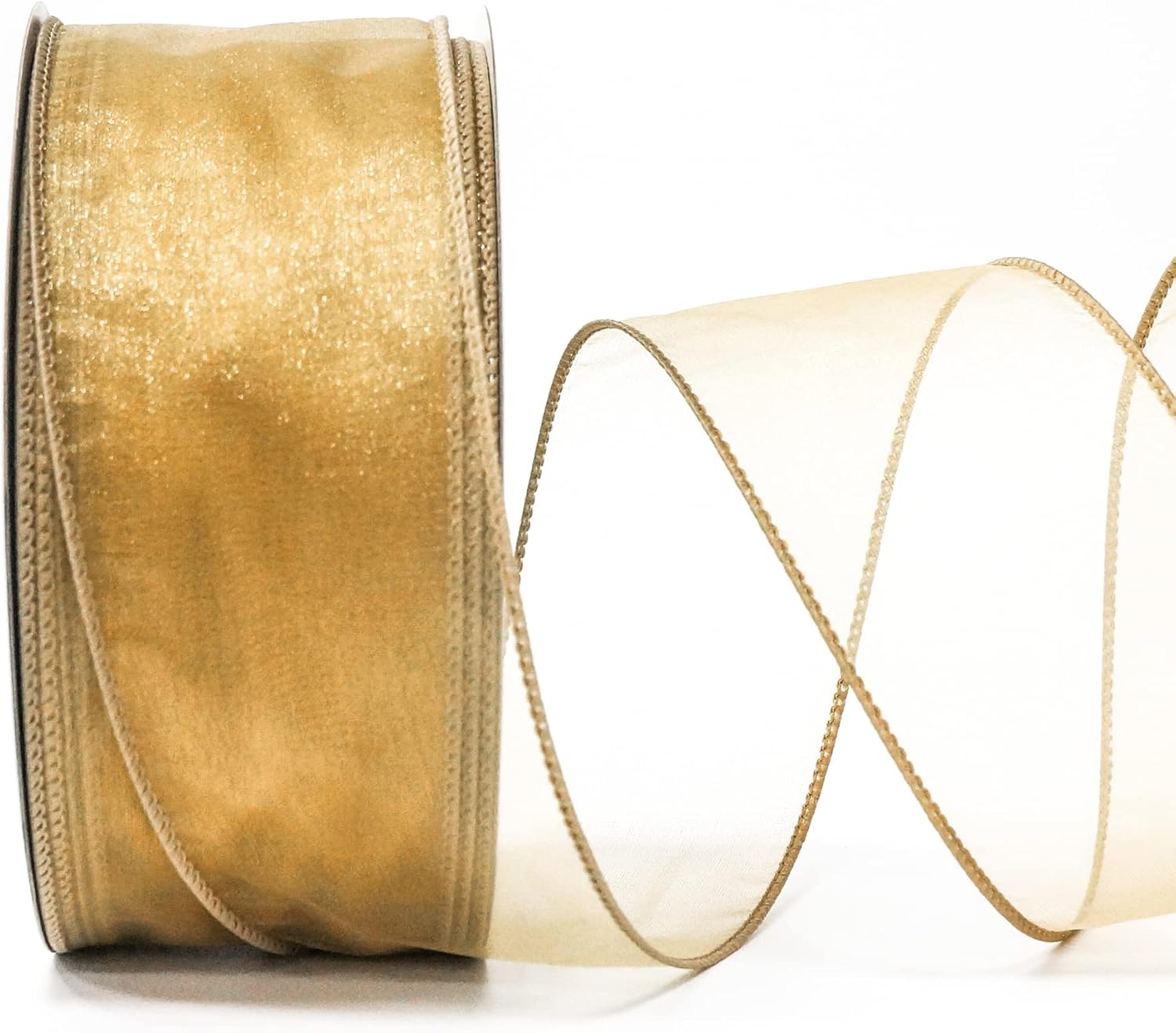 - GREAT WORKMANSHIP - Our Sheer Organza Wired Ribbon 2.5" has a density weave so you wonโt find any loose edges. You wonโt find any fraying ends or loose strings anywhere, making our Sheer Organza Wired Ribbon 2.5" Tan (Gold) color perfect for high-end and professional DIY works and Crafts.