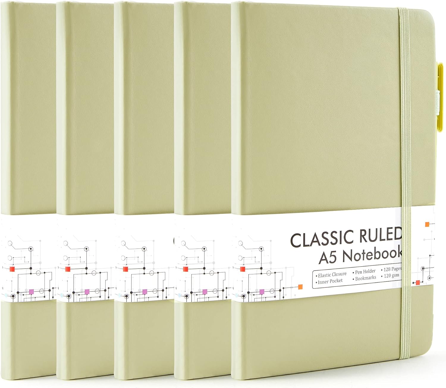 feela 5 Pack Notebooks Journals Bulk, Hardcover Classic Ruled Lined Journals with Pen Holder for Women Girls School Business Supplies, with 5 Black Pens, 120 GSM, 5.1”x8.3”, A5, Avocado Green
