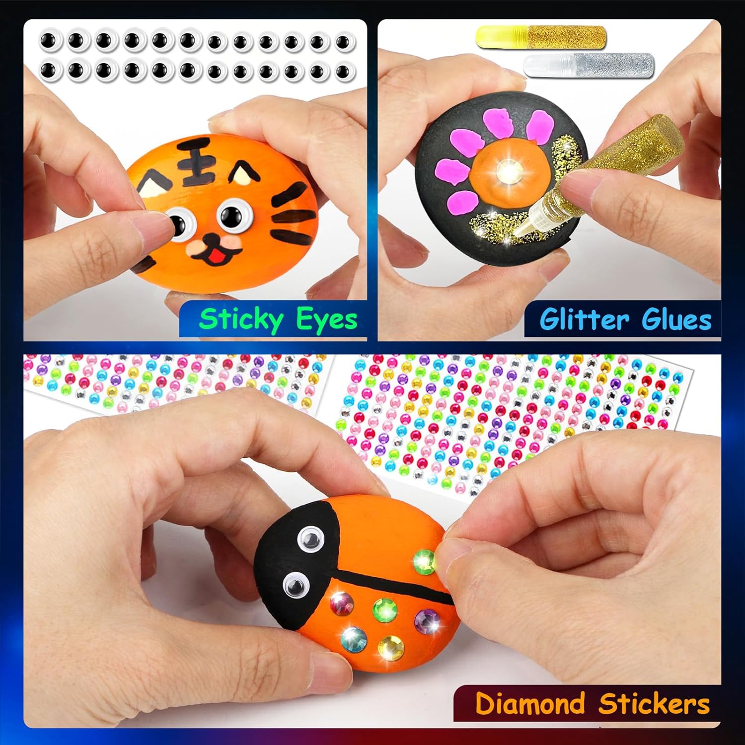 - 🌟【HIGH QUALITY & SAFE ROCK PIGMENTS】Boasting 12 vibrant, eco-friendly and non-toxic acrylic paints, indulge your color dream. Plus, 2 sheets of dazzling diamond stickers & 2 types of glitter glue elevate your artwork with a sparkly touch. Whether adorning rocks or outlining as a border, they transform your creations into eye-catching, one-of-a-kind masterpieces.