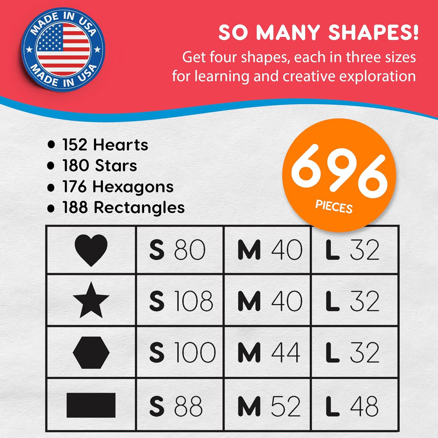 Basic Shapes 2: Hearts, Stars, Hexagons, Rectangles, 696 Pieces US Made Card Stock Punch Out Geometric Shapes in 3 Sizes and 4 Primary Colors for Math, Pattern Play and DIY Crafting