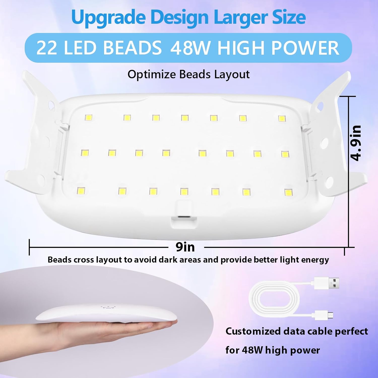 - 💎【22 Beads and 48W High Power】:22 dual light source lamp beads, uniform cross layout, better light effect. 48W high power, making the production more efficient. Large size light can cure multiple projects at one time. Optional l light-up time, up to 5 minutes of timing, providing more scenes for our creations.