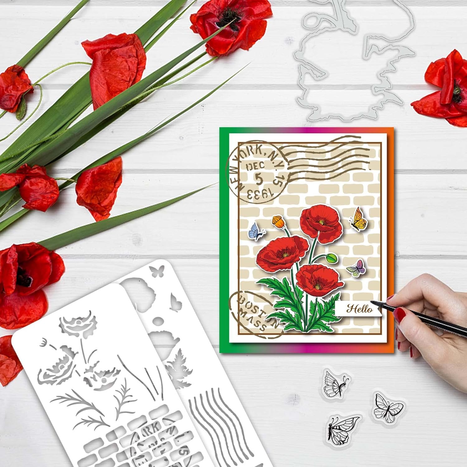 - Package Include: A bundle of corn poppy flower theme coordinating clear stamps, coordinating cutting dies, and 2 pcs coordinating coloring stencils.