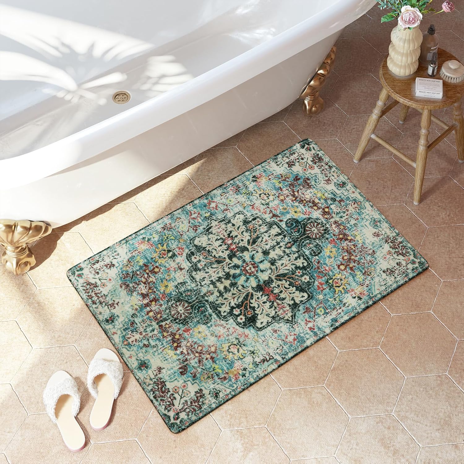 Lahome Boho Bohemian Area Rug - 2x3 Small Washable Bathroom Entryway Kitchen Rug,Floral Medallion Non Slip Pet Friendly Vintage Throw Carpet for Indoor Front Door Sink Living Room Bedroom,Teal
