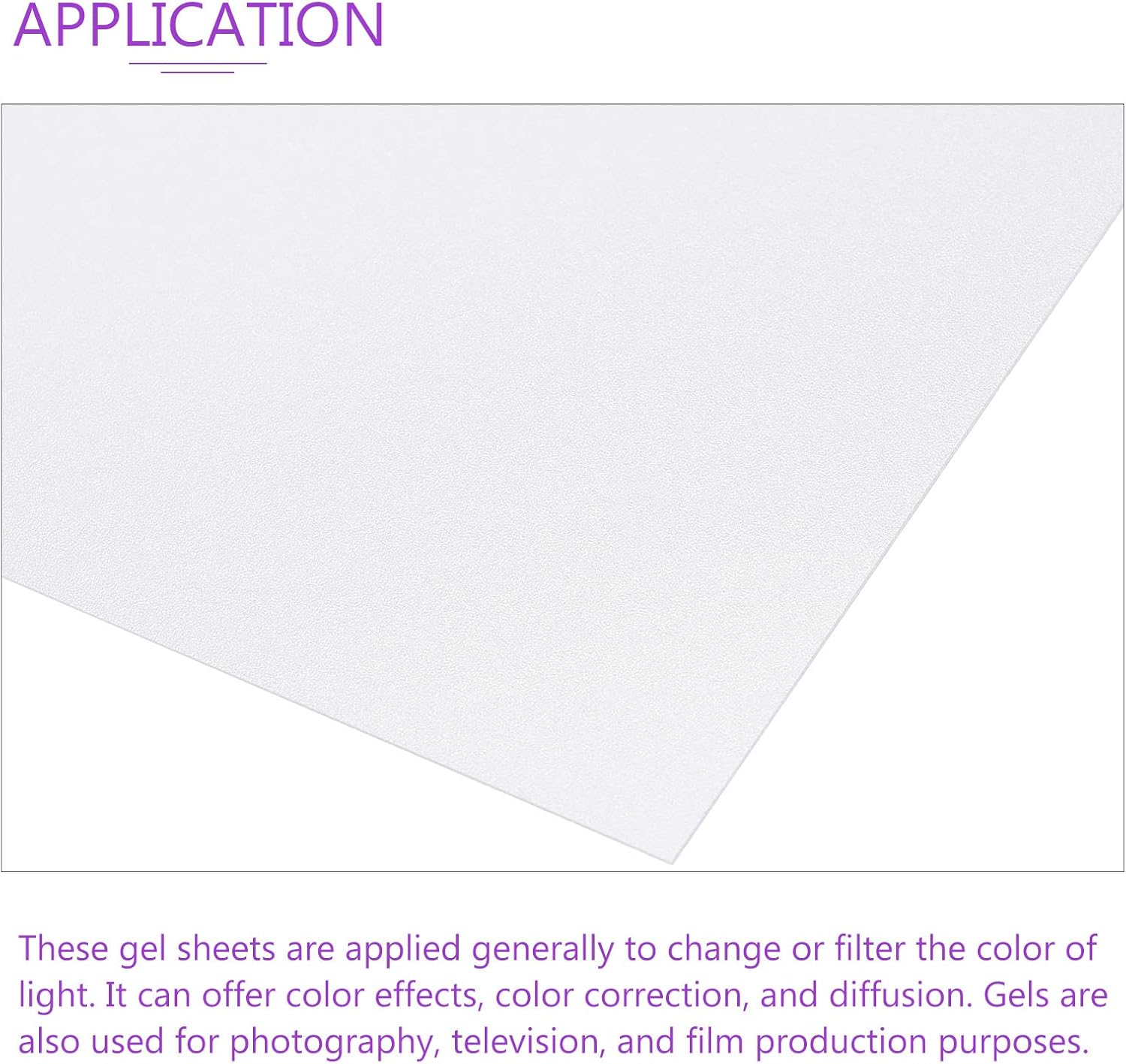 - APPLICATION: These gel sheets are applied generally to change or filter the color of light. It can offer color effects, color correction, and diffusion. Gels are also used for photography, television, and film production purposes.