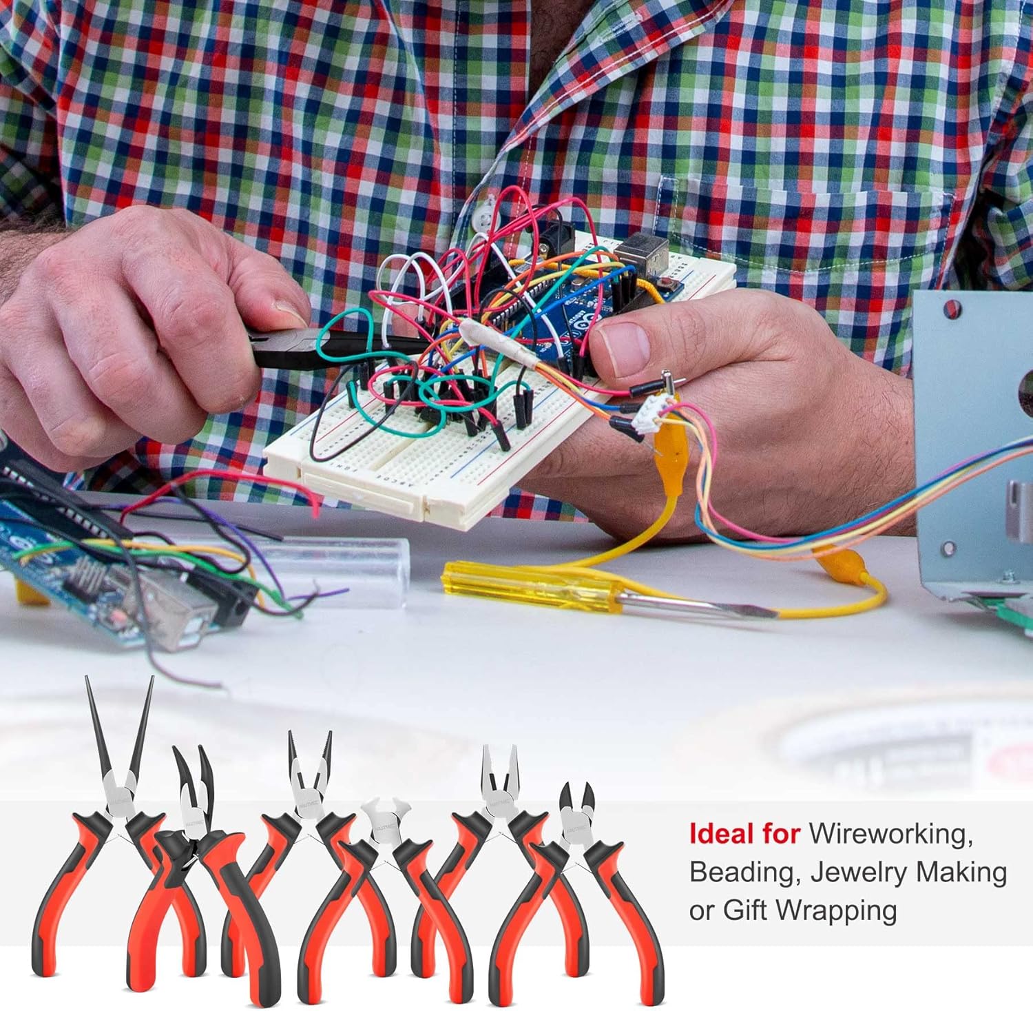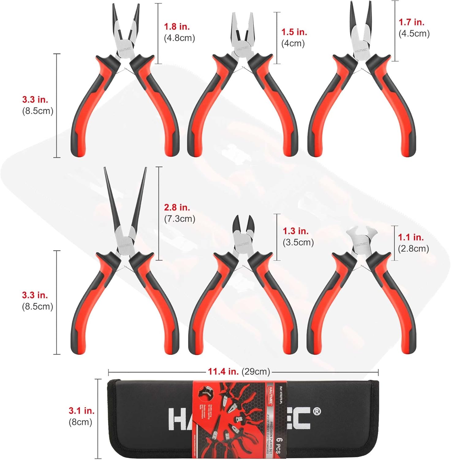 - Package Include: 6PCS mini pliers set with 6 inch small needle nose pliers, 5 inch linesman pliers, 5 inch mini long nose pliers, 5 inch mini bent nose pliers, 4.5 inch diagonal pliers and 4 inch end cutting pliers.