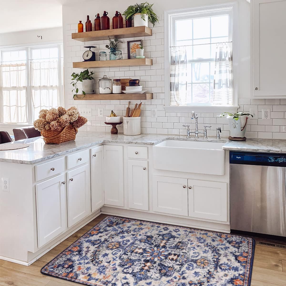 - [Exclusive Design Accent Rug] - The suitable way to brings a refreshing boost of color to your home, this bohemian floral medallion rug is a must-have for your home. It features a blue, orange, and beige design patterns with purposeful distressing to add vintage appeal to your space.