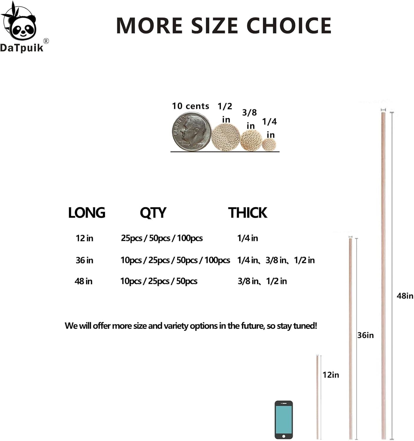 - 1. Size: bamboo dowel rods long 48inch, diameter 1/2 inch. Package Includes: 50Pcs bamboo dowel rods.