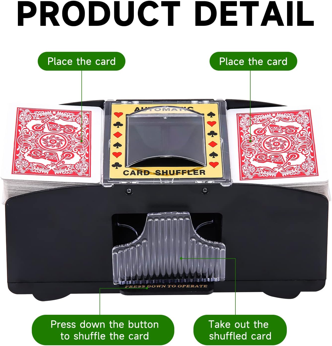 - 【More Convenient-Fully Automatic & Battery Operated】Just Want to play card more fun and convenient anywhere? Unniweei 1-2 deck automatic card shuffler is powered by 4 AA batteries (Not Included). Battery powered,shuffle fast,Shuffles up to 1-2 deck cards in seconds, our automatic card shuffler can release your hand, which can makes your casino card game more fun and convenient. Our card shuffler holds up to 1-2 standard decks of cards.