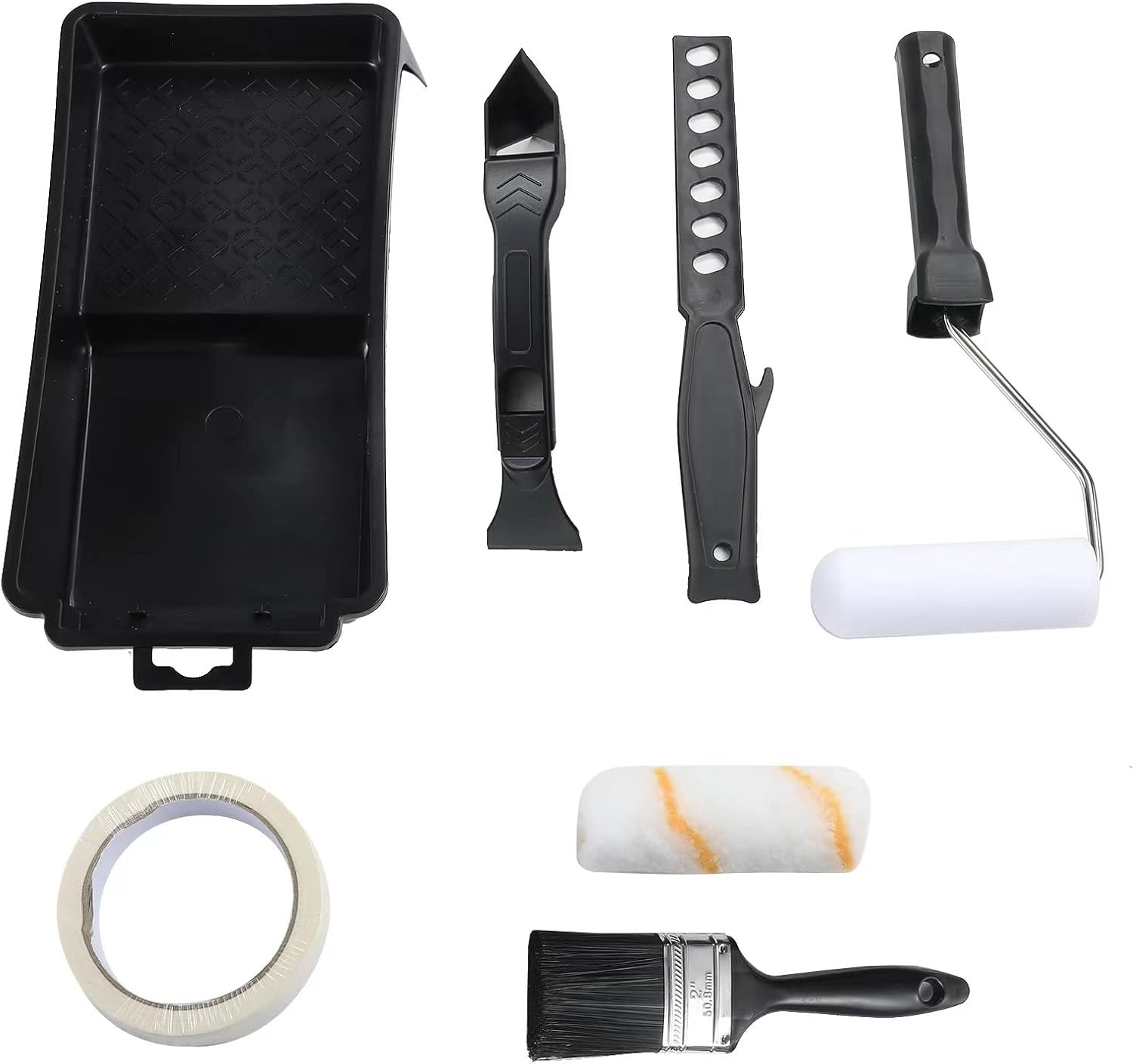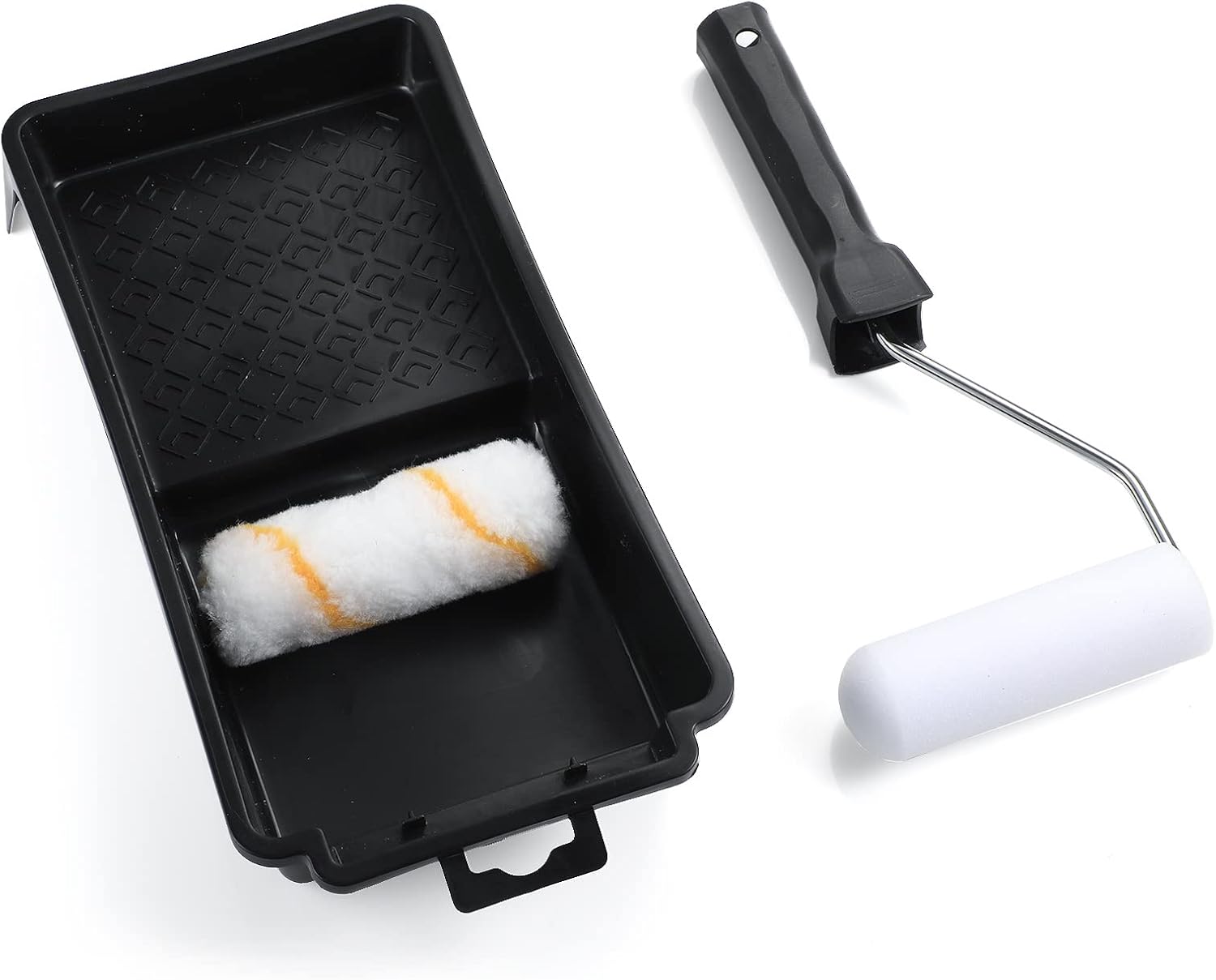 - The painting roller kit includes 8 Pcs tools. 1 X Paint Roller Frame, 1 X High-Density Foam 4”, 1X Acrylic Roller Covers 4”, 1 X Paint Mixing Stick, 1 X Synthetic Fiber Paint Brush, 1X Masking Tape, 1 X Caulk Remover, 1 X Paint Roller Tray