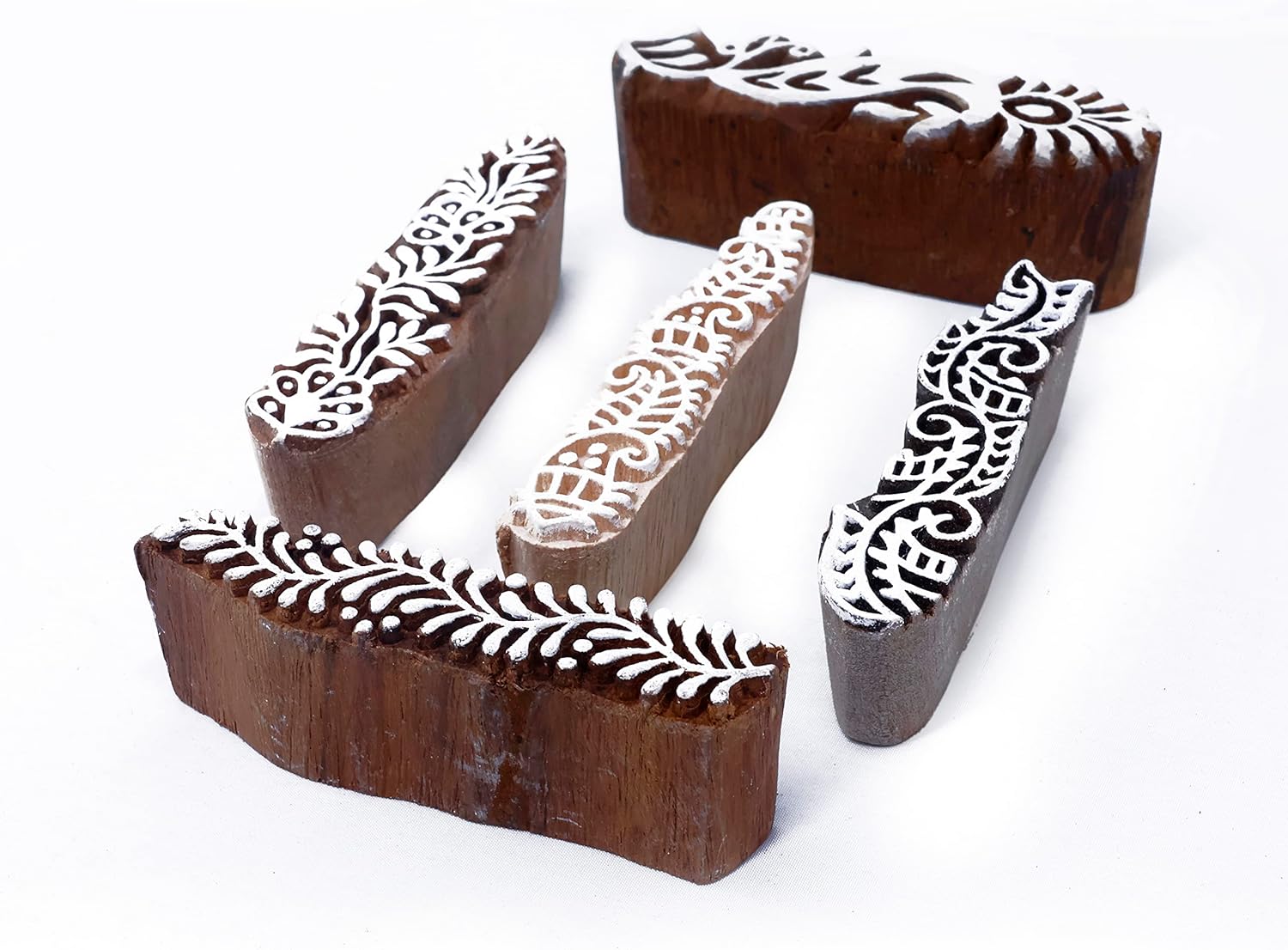 Hashcart | Set of 5 | Mehndi Print Blocks Border Pattern Wooden Stamp, Handcarved Indian Textile Printing Blocks for Crafting on Fabric Clay & Henna Tattoo Saree Border Paper Print Pottery Stamps