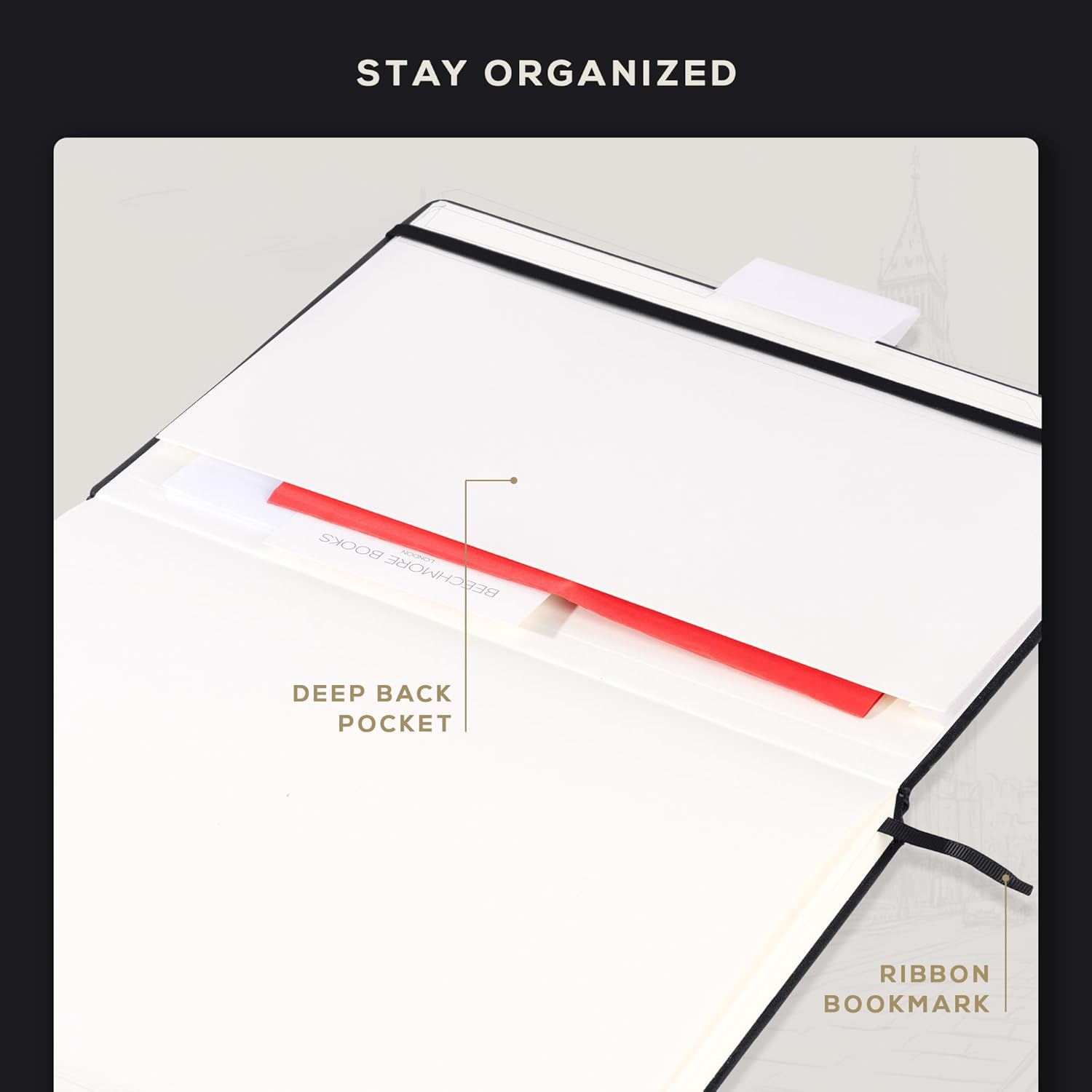 Beechmore Books A3 Sketchbook – 11.7x16.5 Premium Vegan Leather Bound Extra Large Sketch Book Hardcover, 160gsm 160 Perforated Ivory Pages, Blank Sketch Pad, Gift Boxed, Back Pocket, Ribbon Bookmark