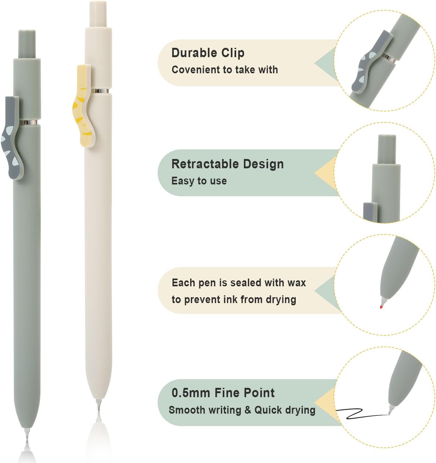 - Quick-drying Ink:The tip of the gel pens consists of a 0.5mm fine point pen, which is smooth and continuous in ink. The quick-drying ink is immediately dry and will not be smeared, keeping your books or paintings clean and tidy