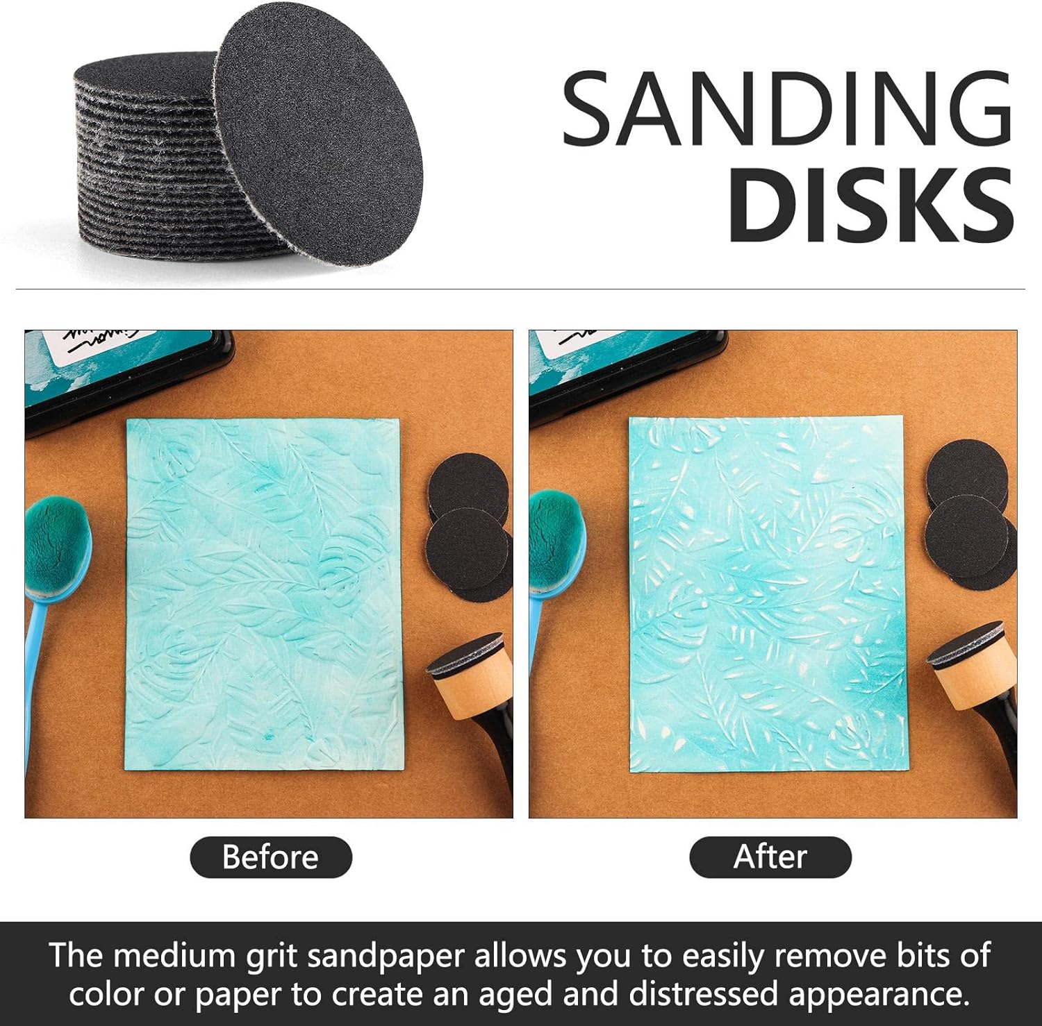 - 【SANDING DISKS】These sanding disks are ideal for sanding and distressing all of your craft projects. This is medium-grit sandpaper that provides the right amount of friction to be used on cardstock, chipboard, wood, and more.These disks also work with the Mini Ink Blending Tool.